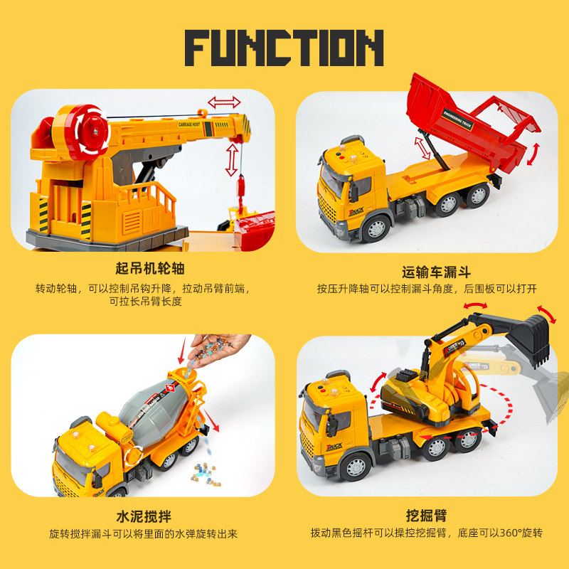 (large) truck (send 5 stones) (large) excavator (send 5 stones) (large) mixer truck (send mixing material) (large) crane (send 2 trolleys) (large) sound