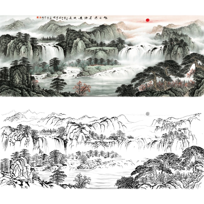 Gongbi painting banner landscape white drawing manuscript rising sun east large scale traditional Chinese painting copy physical printing line draft FS12