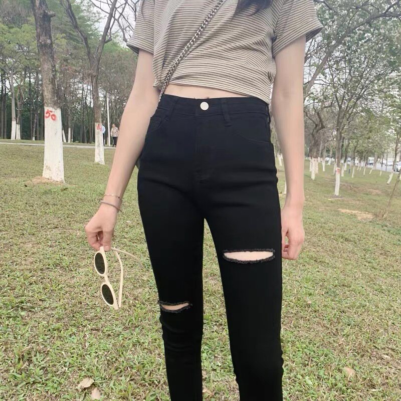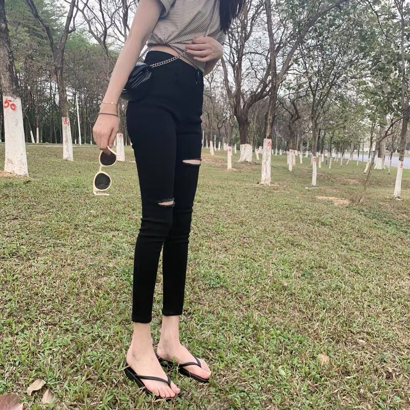 South Korea 2022 Chunqiu New Black Broken Cave Jeans Woman 90% High waist tight and thin smoke tube Pants Chauxia