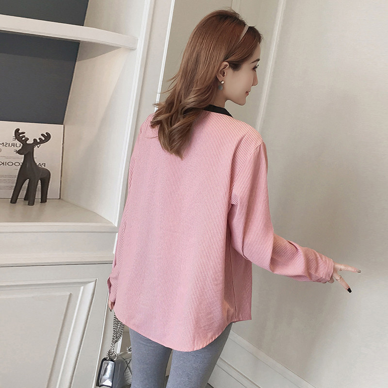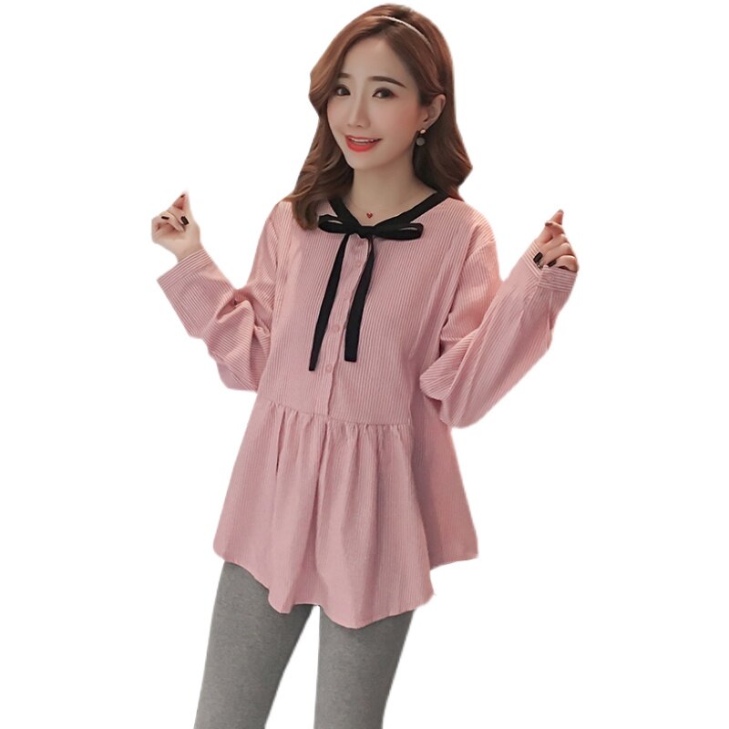 Pregnant women dress spring and summer Korean version of the round neck with long sleeve striped shirt mom loose leisure tops to breastfeed