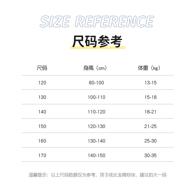 130 (recommended height 100-110cm weight 15-18kg) 140 (recommended height 110-120cm weight 18-21kg) 15