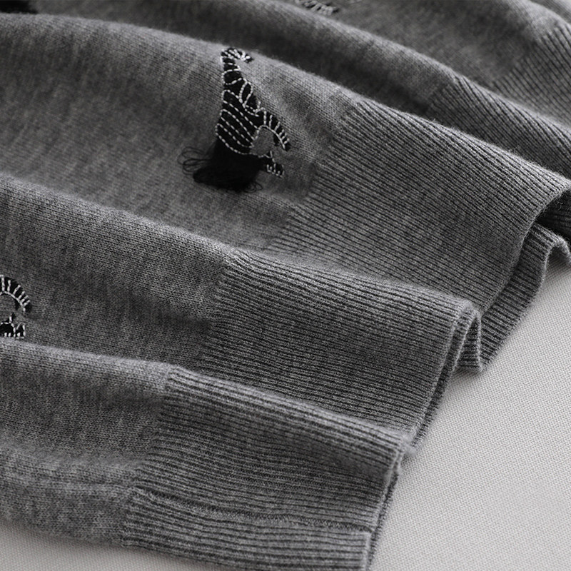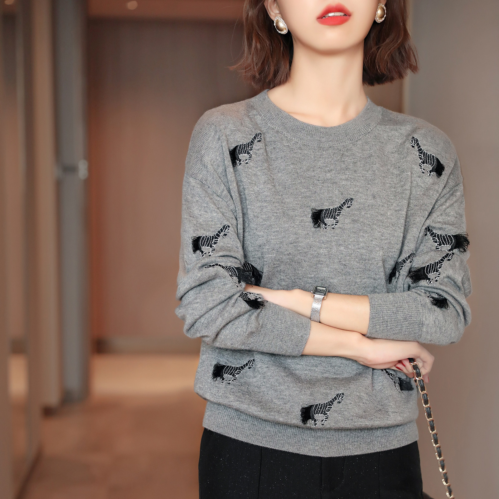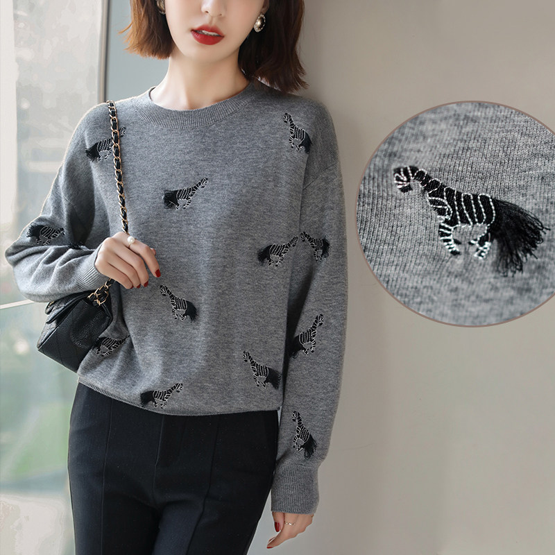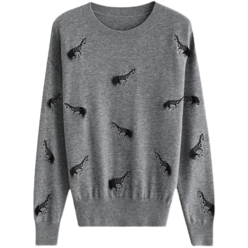 FENPERATE 2022 Early spring new grey zebra embroideries Lazy Wind 100 Lapped Collar Sweater Woman