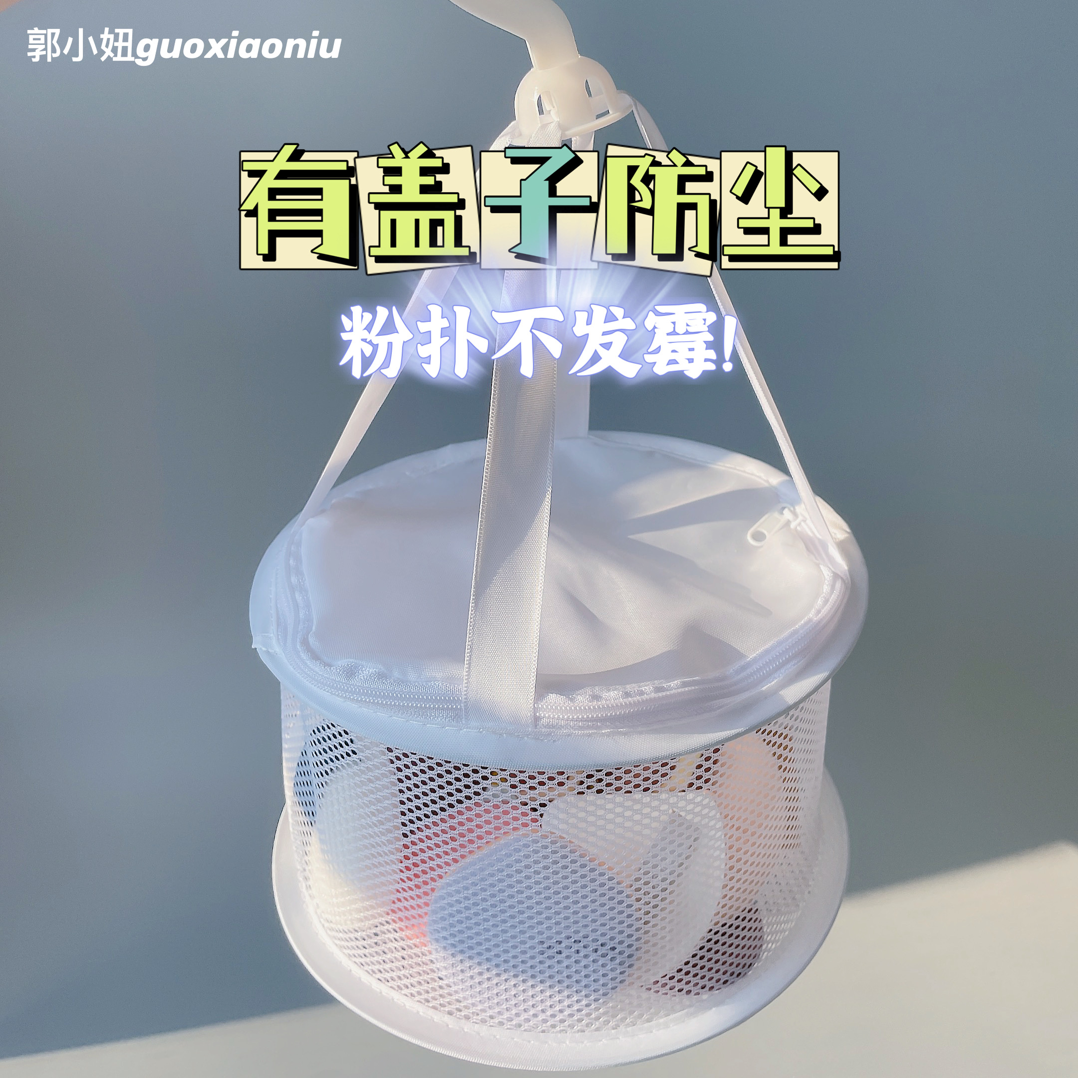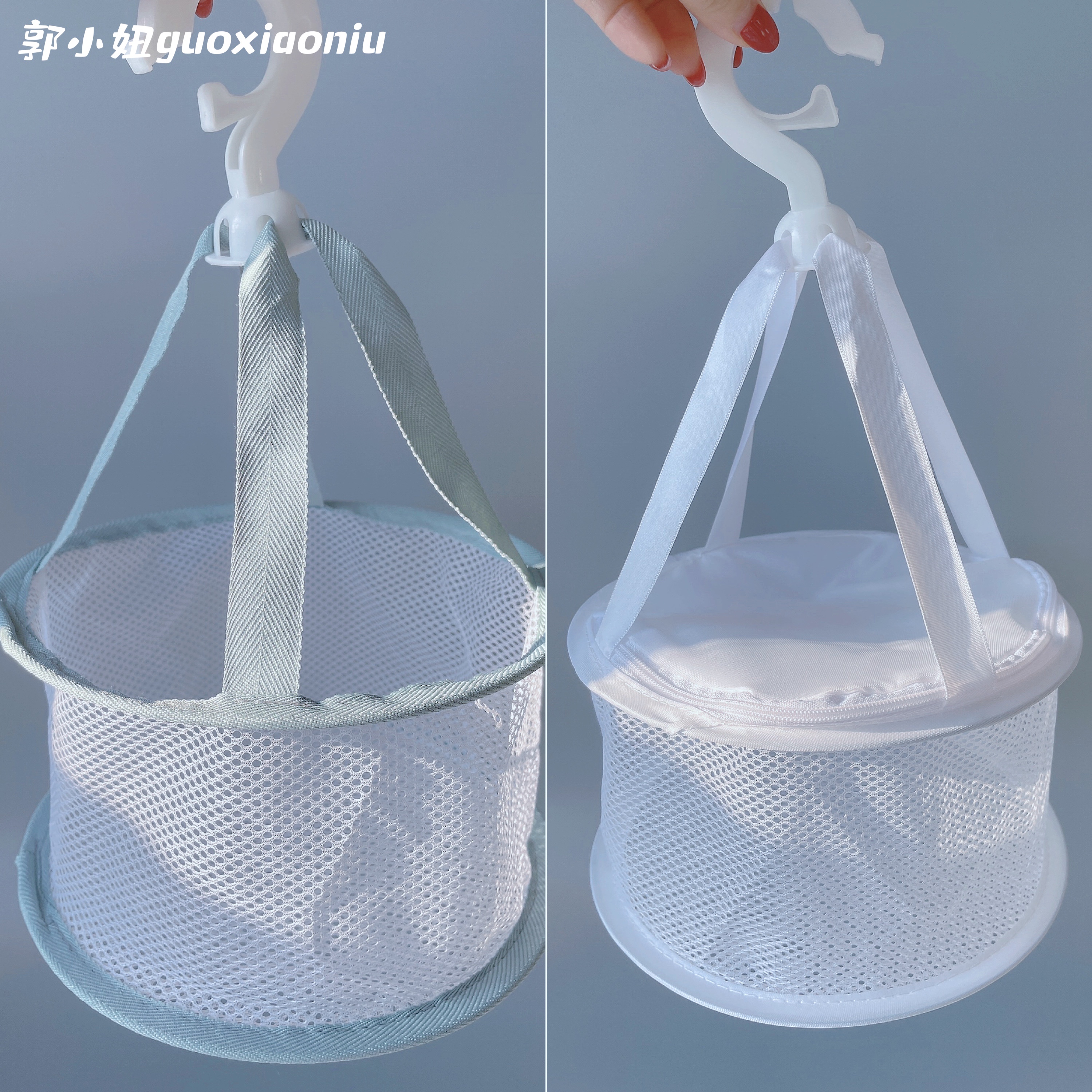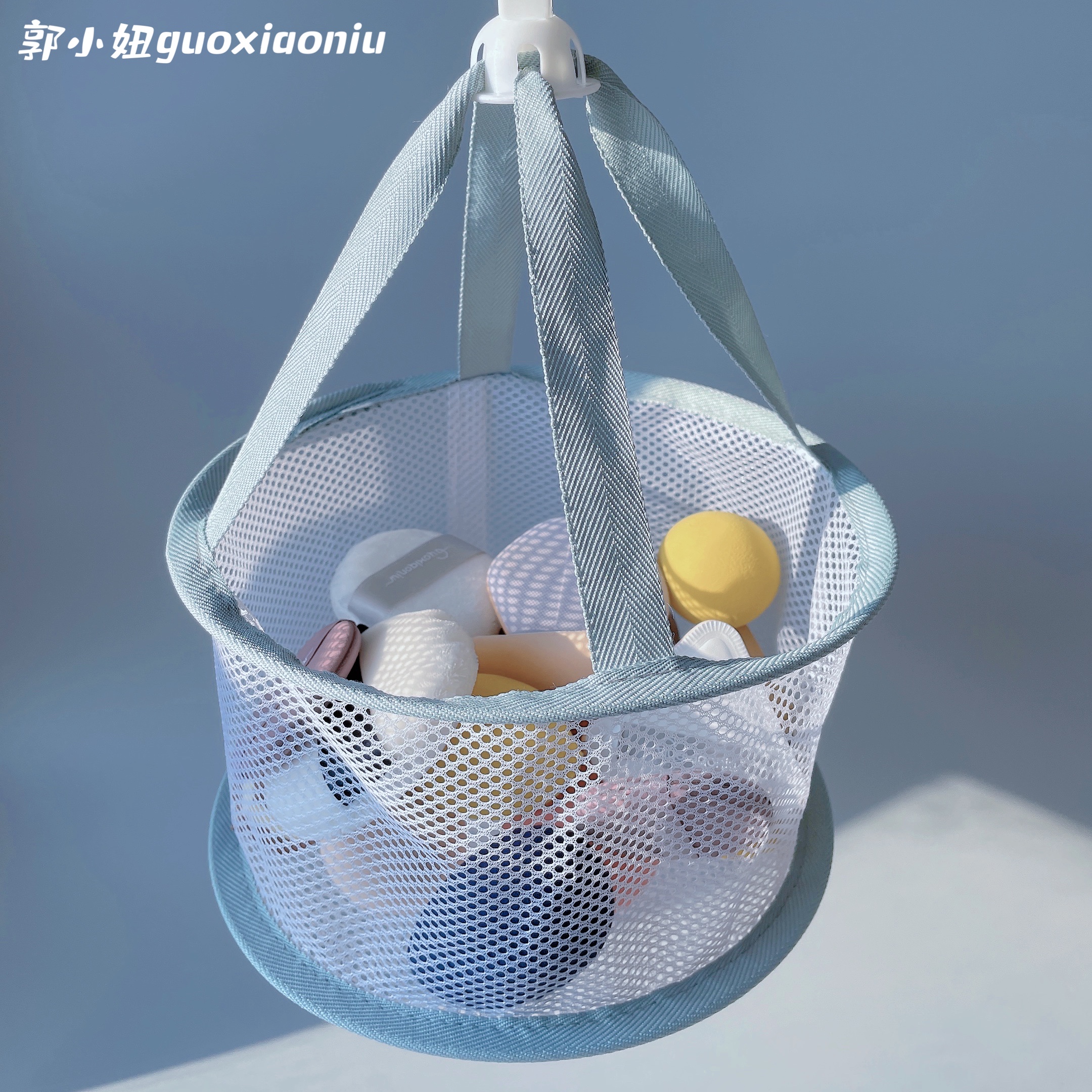 White and purple mesh pocket with one grey mesh pocket, small puff bag, two grey mesh pockets without cover, gray mesh pocket with no cover, and retractable brush bucket, white mesh pocket with cover, purple washing bowl, brush holder grey