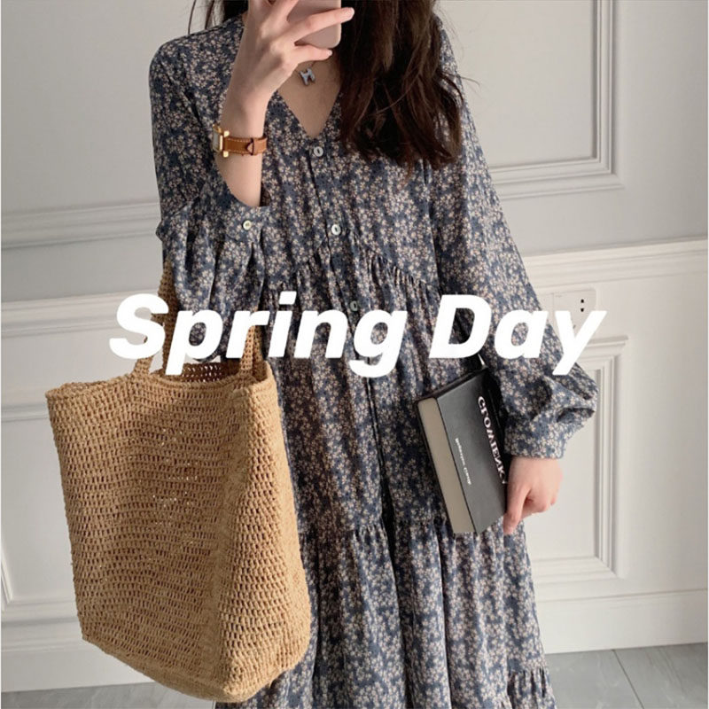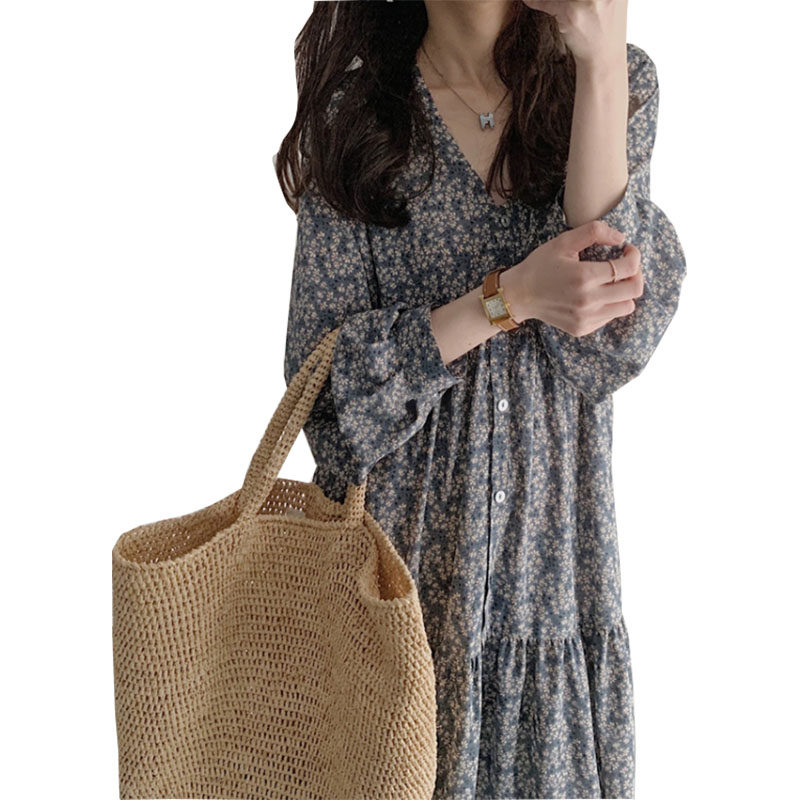 2022 Spring Summer New Loose Conspicuic Style Retro Long Sleeve V Collar Crushed Flowers Snowspun Pregnant Woman Foreign Dress Autumn Clothing