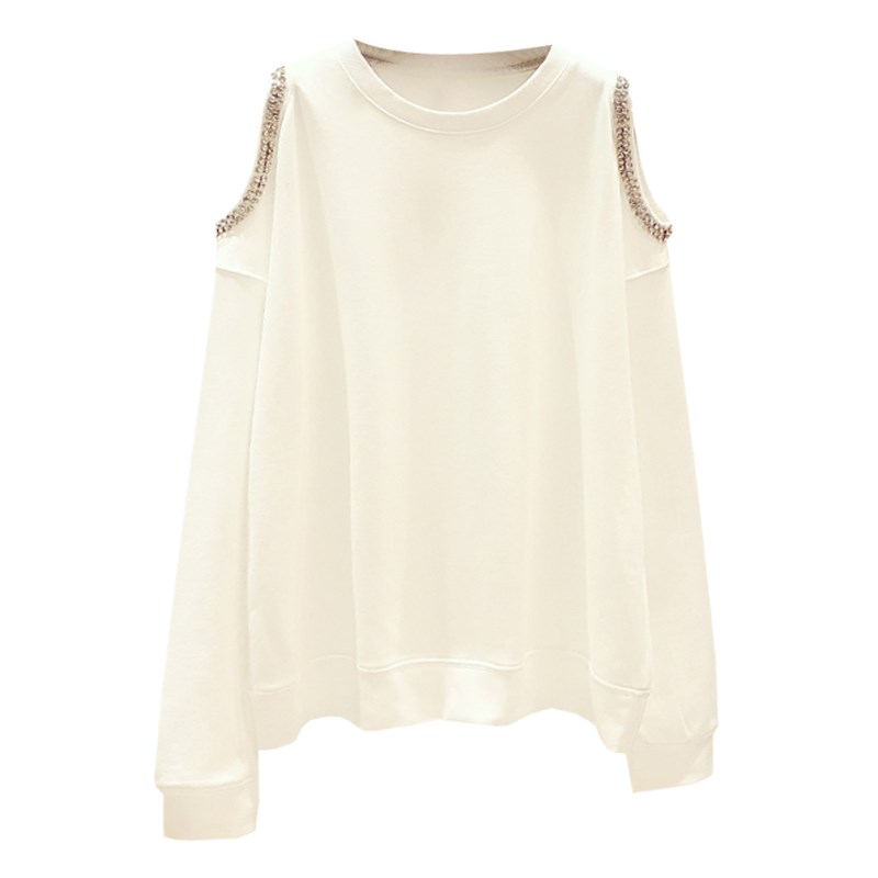 Hong Kong diamond-studded off-the-shoulder long-sleeved thick cotton T women's autumn 2022 spring round neck loose T-shirt scheming design top trendy