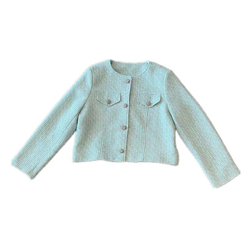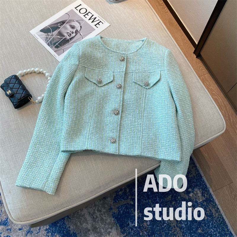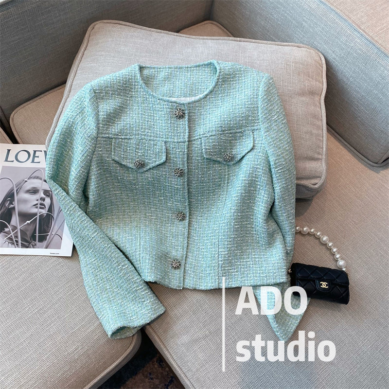 Small fragrant wind name Yuanyuan jacket female spring and autumn long sleeves thick flower, easy single row of buckle green round collar short version open flap jacket blouse