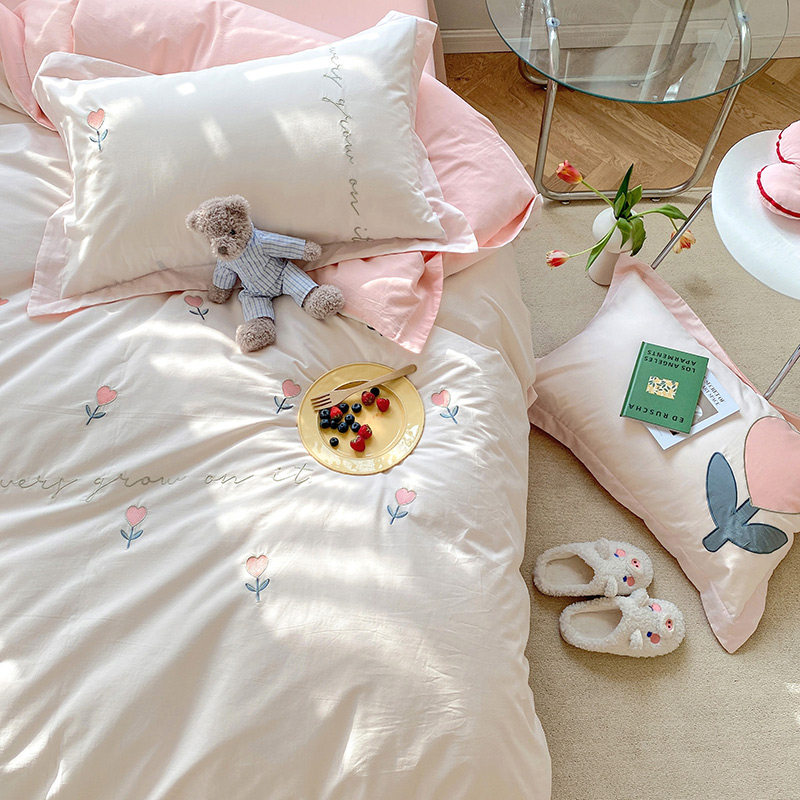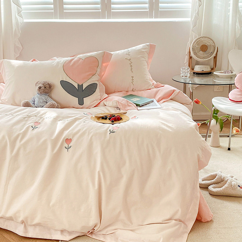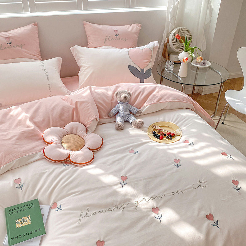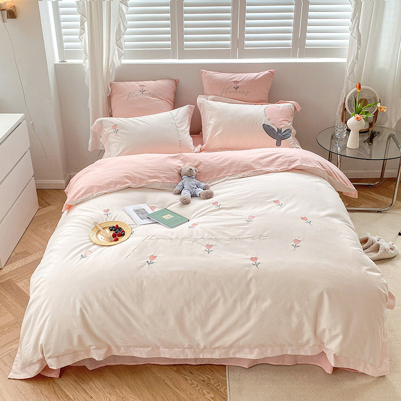 Fan Residence Summer New Washed Cotton Embroidered Bed Four Sets Full Cotton Cute Little Fresh Home Bed Product Quilt Cover