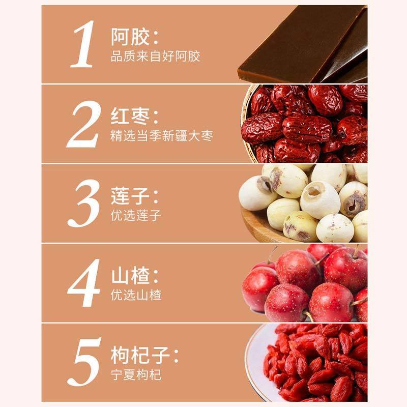 Ejiao, red dates, lotus seeds, hawthorn and wolfberry
