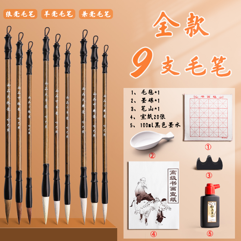 A full set of 9 pieces (concurrently, wolf hair, sheep hair), concurrently, capital letter, middle case, small case, 3 pieces (moderate elasticity, suitable for beginners) wolf hair, upper case, middle case, small case, 3 pieces (good elasticity)