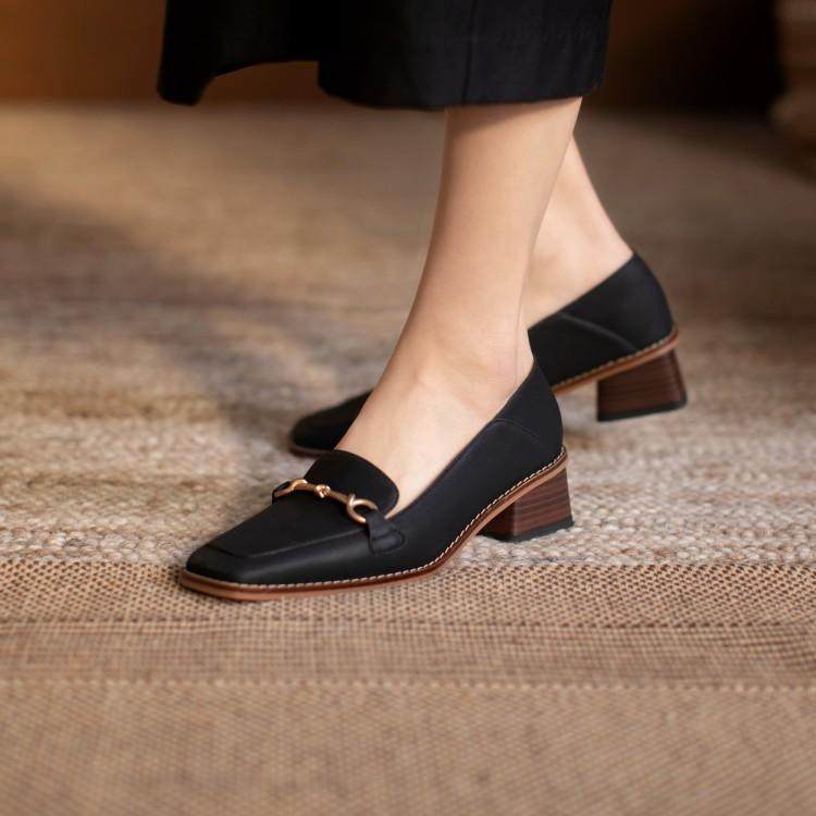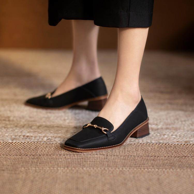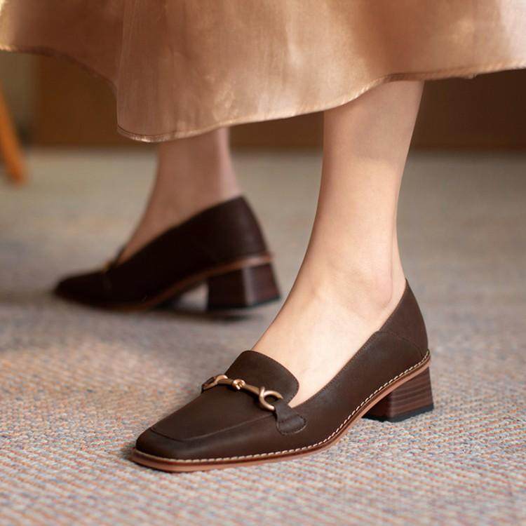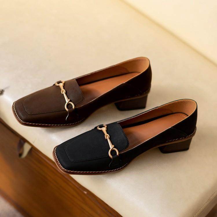 Old Board Lady Recommended Super Good Wearing Retro Metal Buckle Square Head Lefu Shoes 2022 Spring Coarse Heel Wrapping Shoes