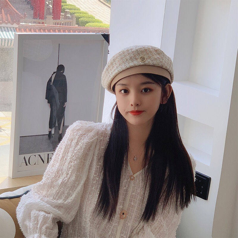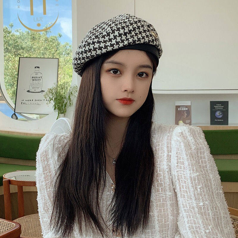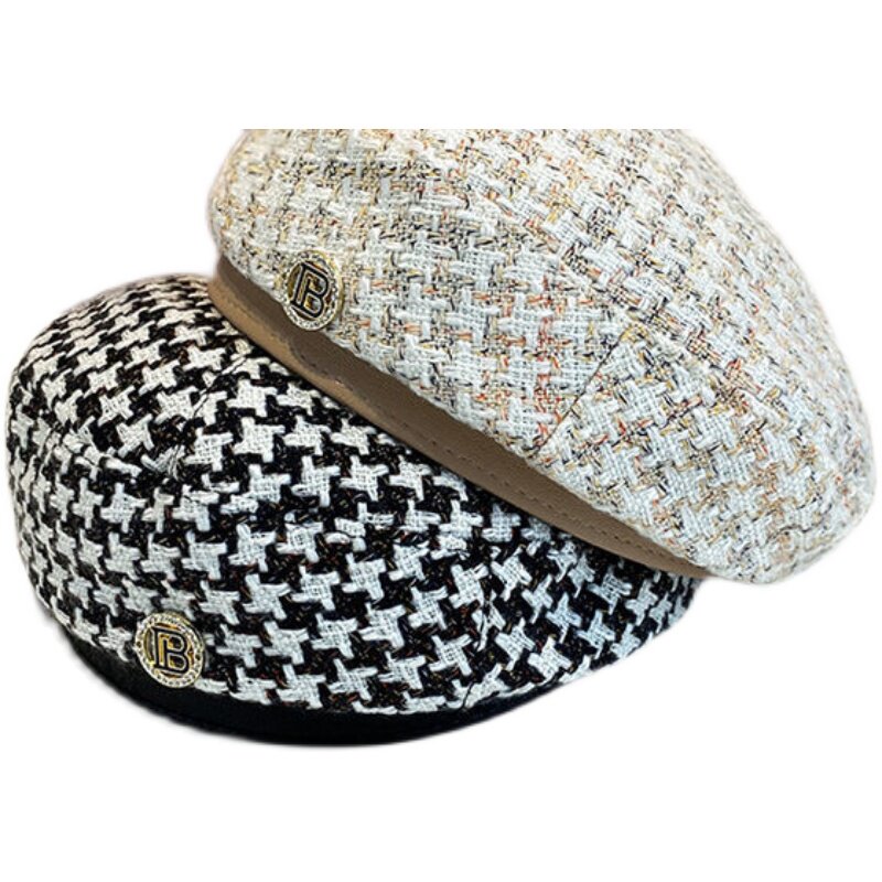 Xiaoxiangfeng houndstooth beret female British retro octagonal hat Korean version fashion woven bud hat painter hat tide