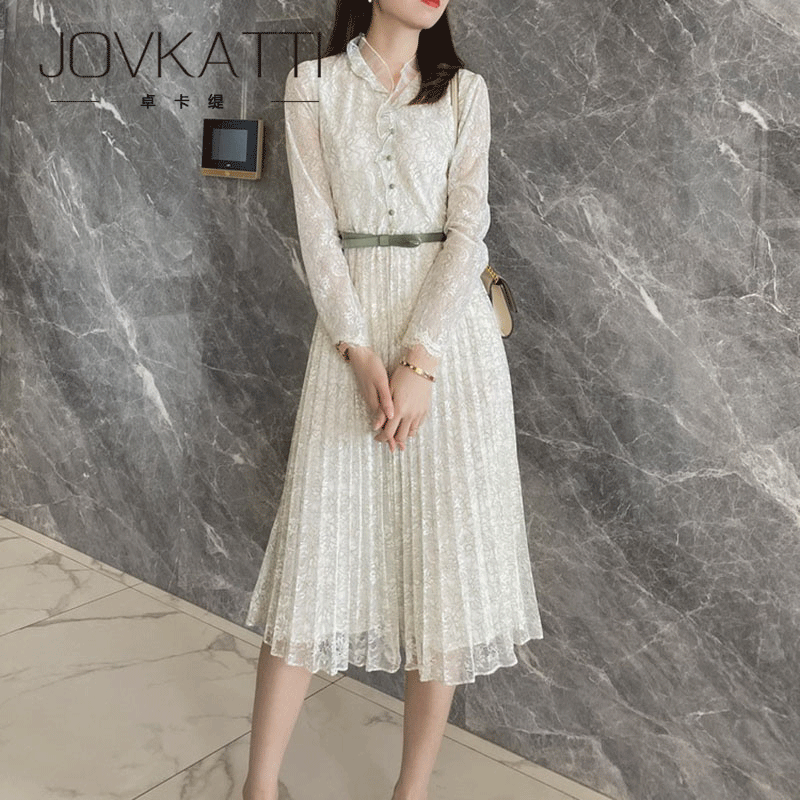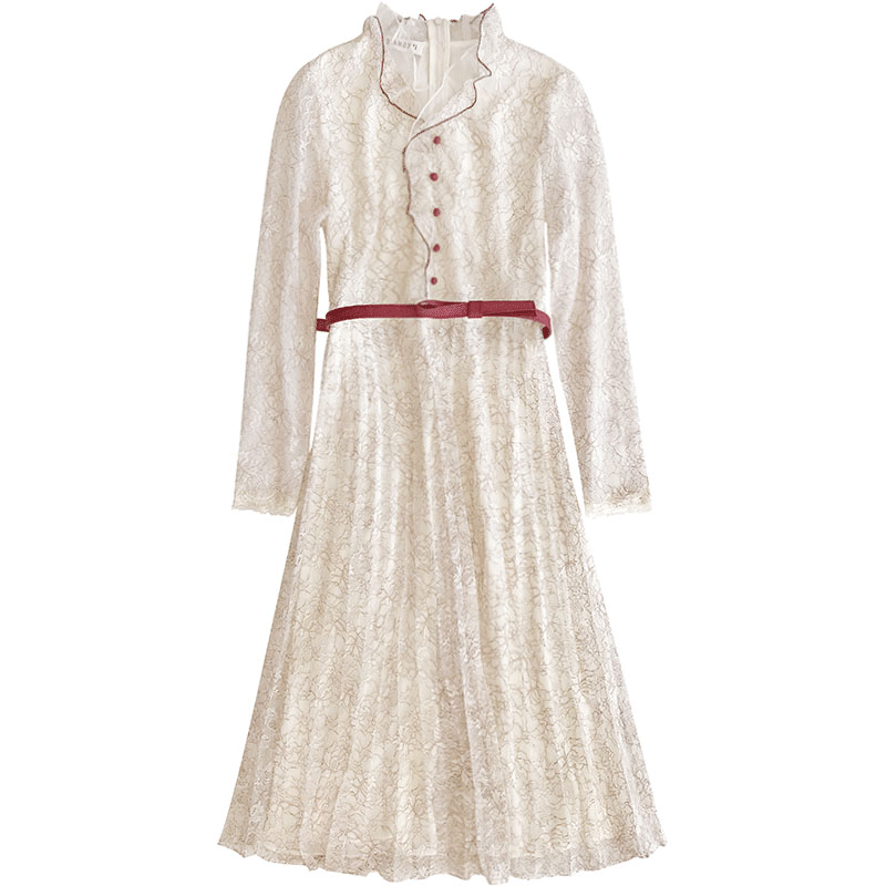 Japanese light luxury high-end ladylike design sense niche lace dress ruffled collar pleated temperament fairy skirt
