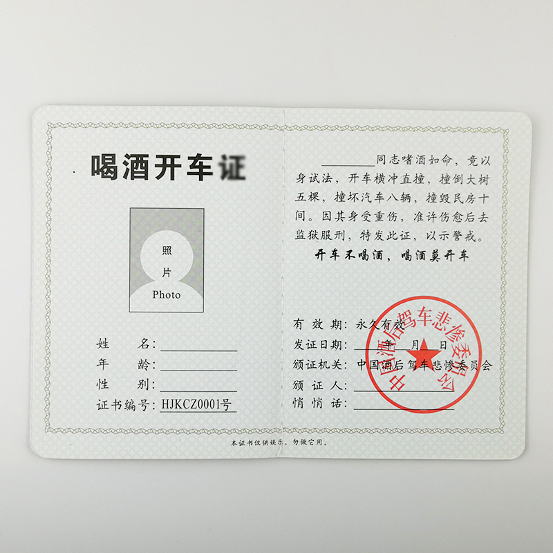Funny Certificate Drinking Driving Certificate DIY Fun Birthday Festival Gift to Friends Creative Gift