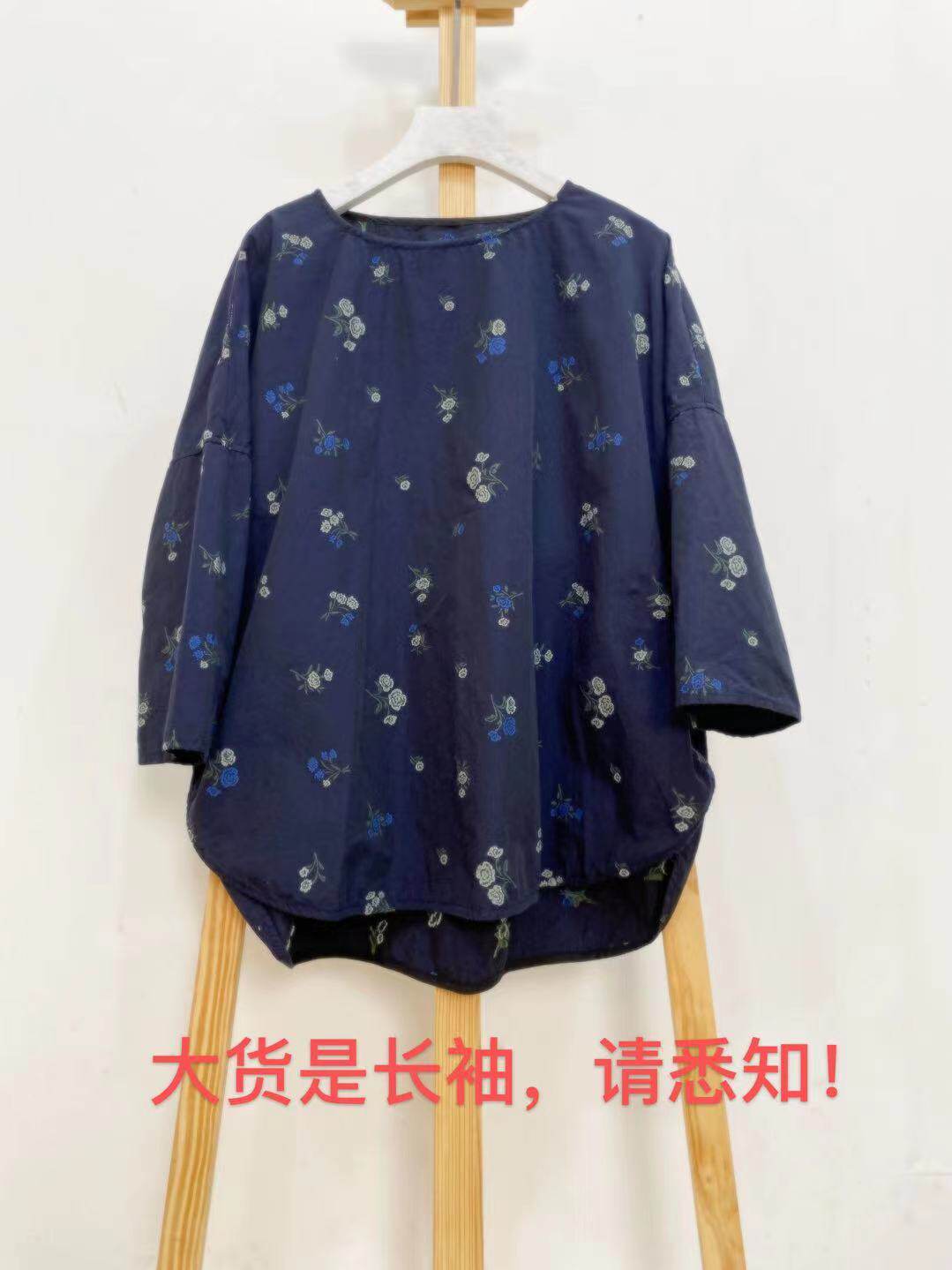 Summer cotton loose round neck flower top early autumn retro literary style Joker high fork women