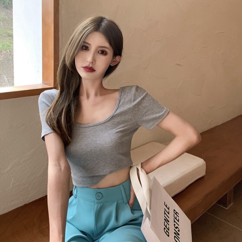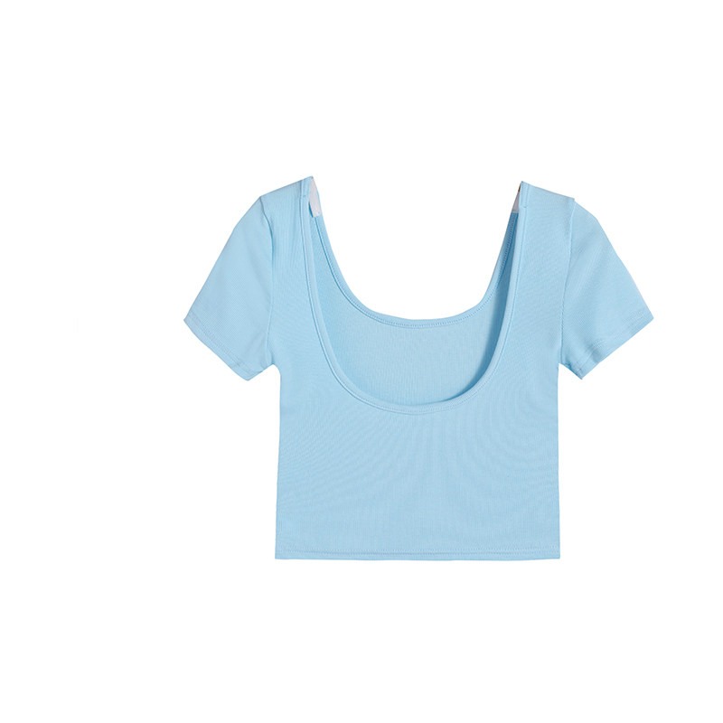 Vanya's new short sleeve T-shirt summer tight design of the niche revealed the back U-collar short pure-colored tops