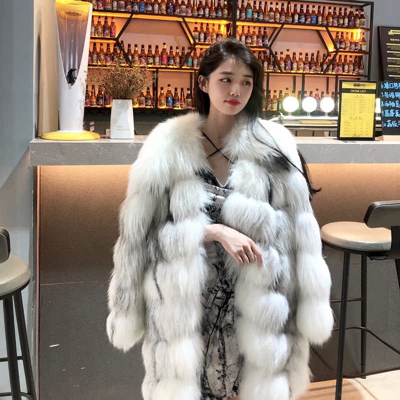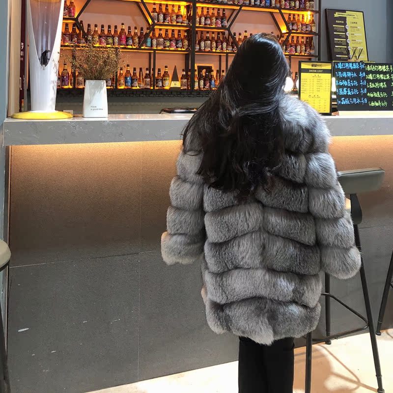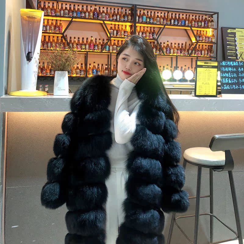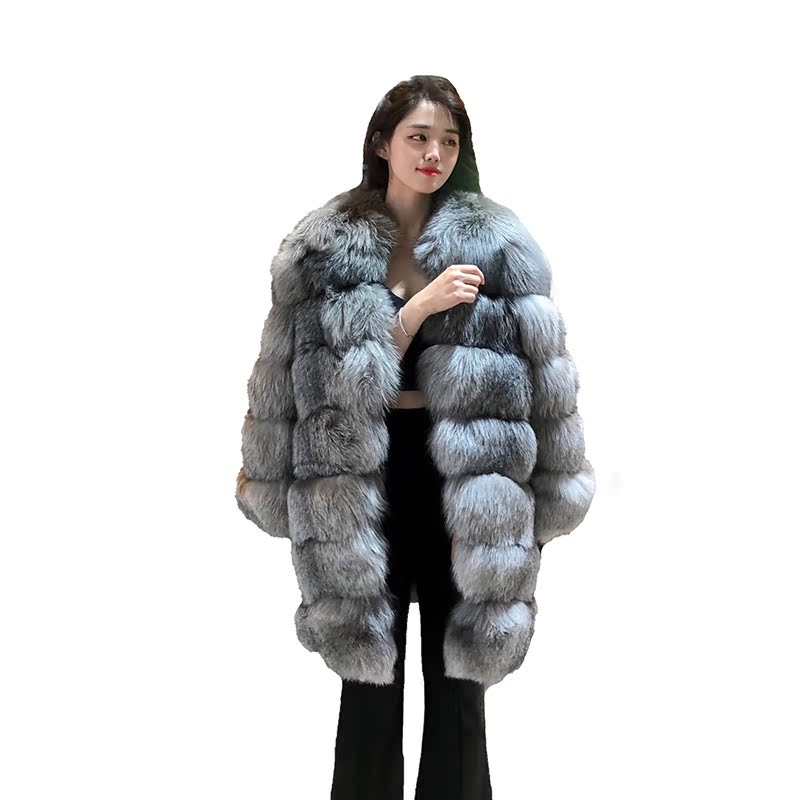 2021 winter new imported whole leather fox fur coat silver blue fox mid-length black thermal coat