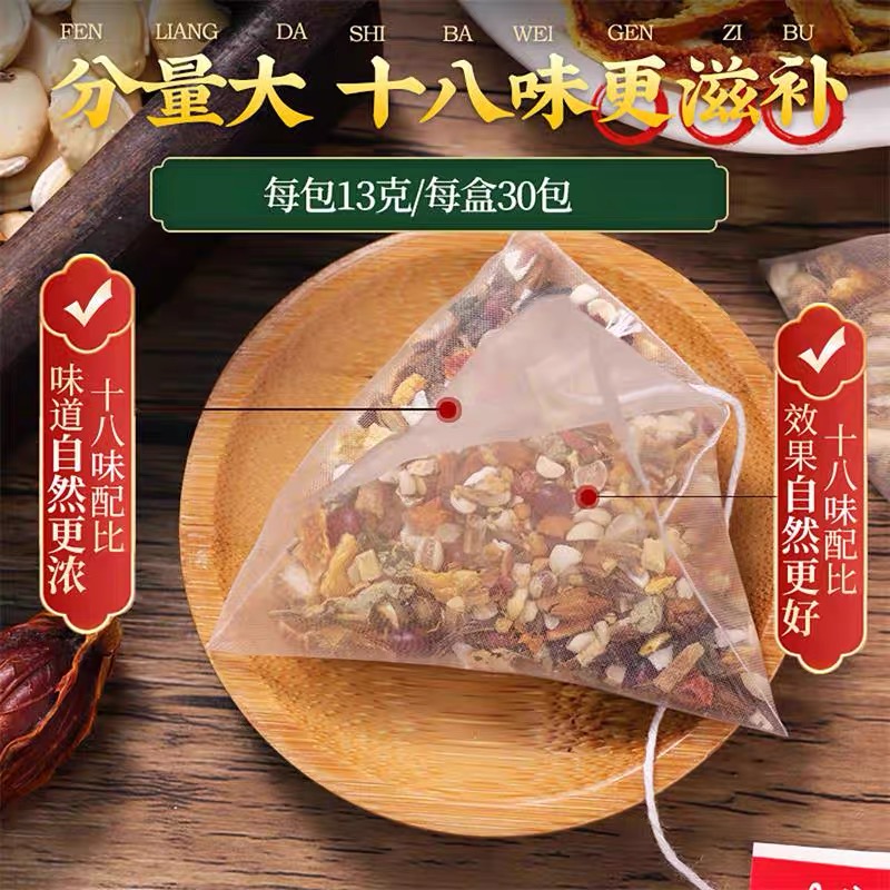 Licorice, Pueraria, Cassia, Bergamot, Burdock, Gorgon, Agaricus, Barley, Yam, Orange Peel, Dandelion, Coix Seed, Poria, White Lentil, Red Date, Endive, Cinnamon, Hawthorn