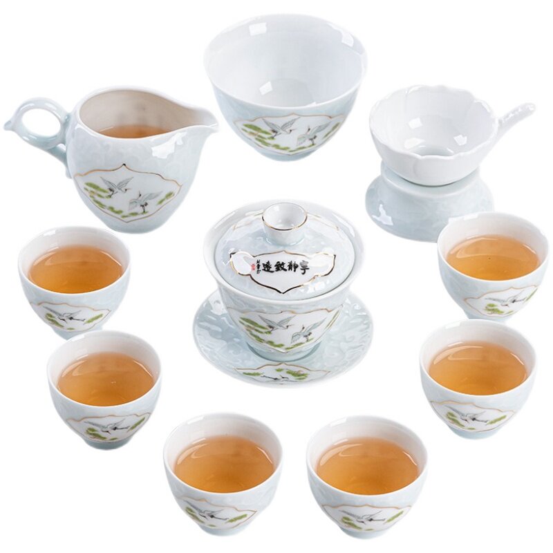 Dehua Suet Jade Sancai Gai Bowl Complete Set of Kung Fu Tea Set Green Ceramic Jade Jade Home Office Gift Box