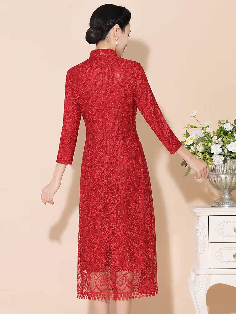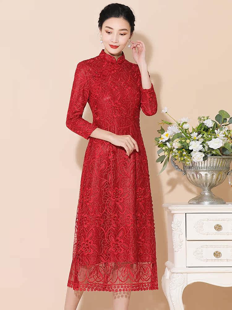 Wedding mother spring and autumn noble high-end festive cheongsam dress happy mother-in-law wedding banquet dress married girl long-sleeved
