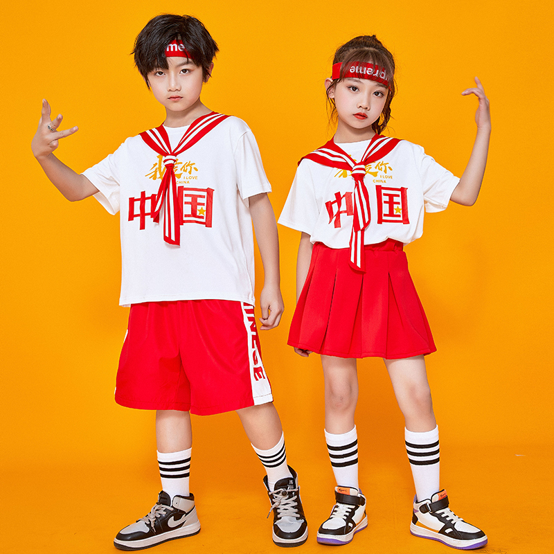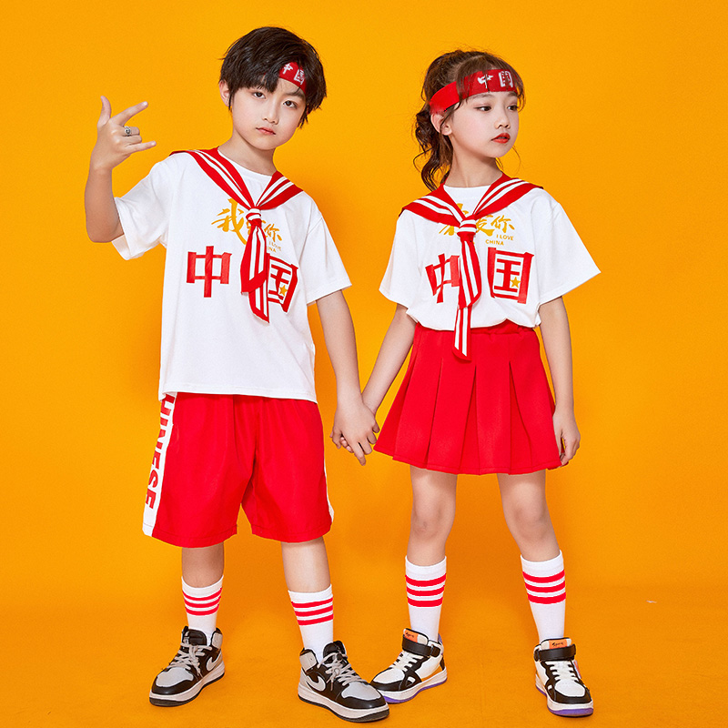 Girls Short Sleeve Suit Boys Short Sleeve Suit Boys Short Sleeve Suit Chinese Hairband Red Striped Socks Girls Short Sleeve Suit Chinese Hairband Red Striped Socks White Short Sleeve Red Scarf Red Shorts