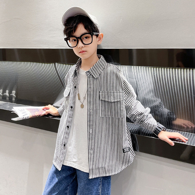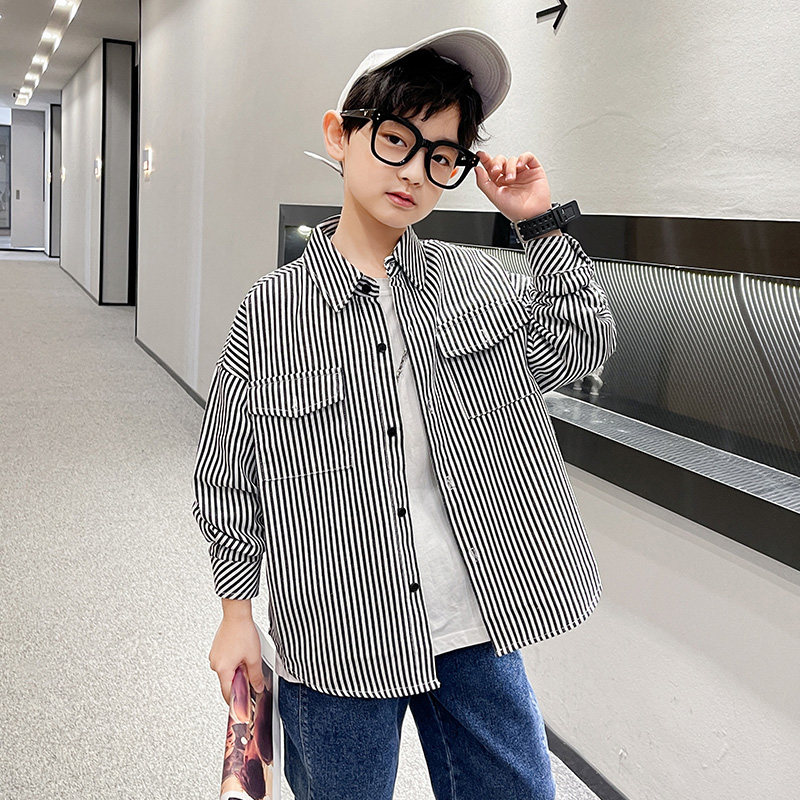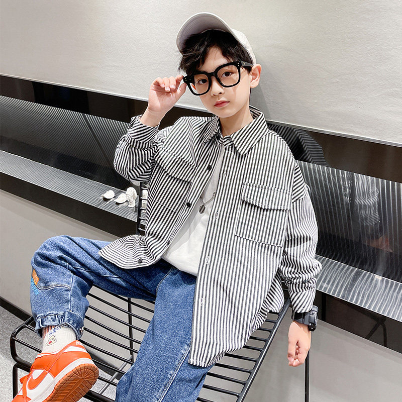 Boy Shirt Spring Dress 2022 New Foreign Pie CUHK Child Striped Shirt Boy Long Sleeve Blouse Spring Autumn Tide