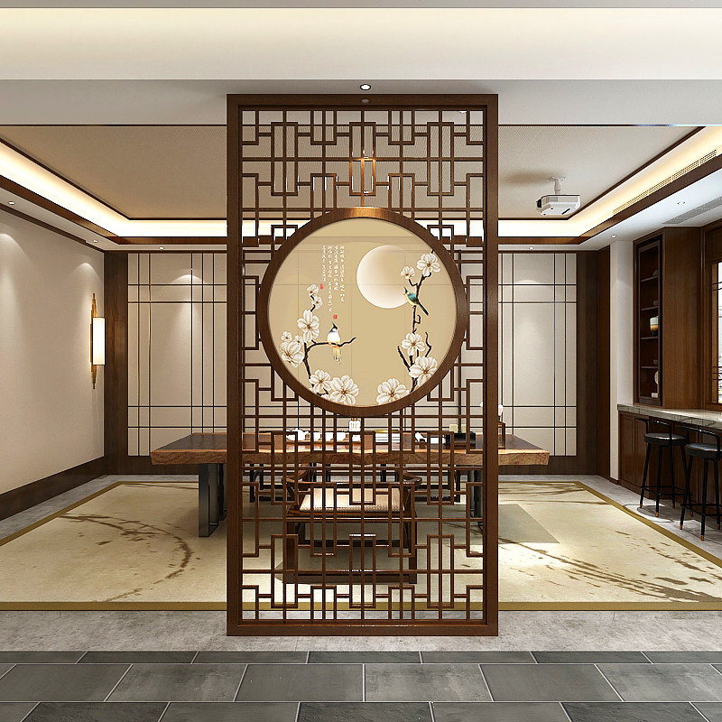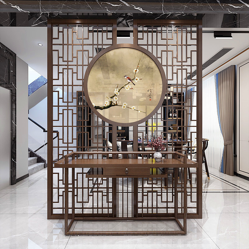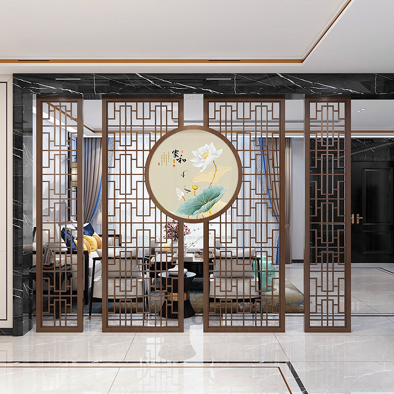 New Chinese-style solid wood screen partition living room log hollow decoration walnut strip grille entrance to block the swastika shape