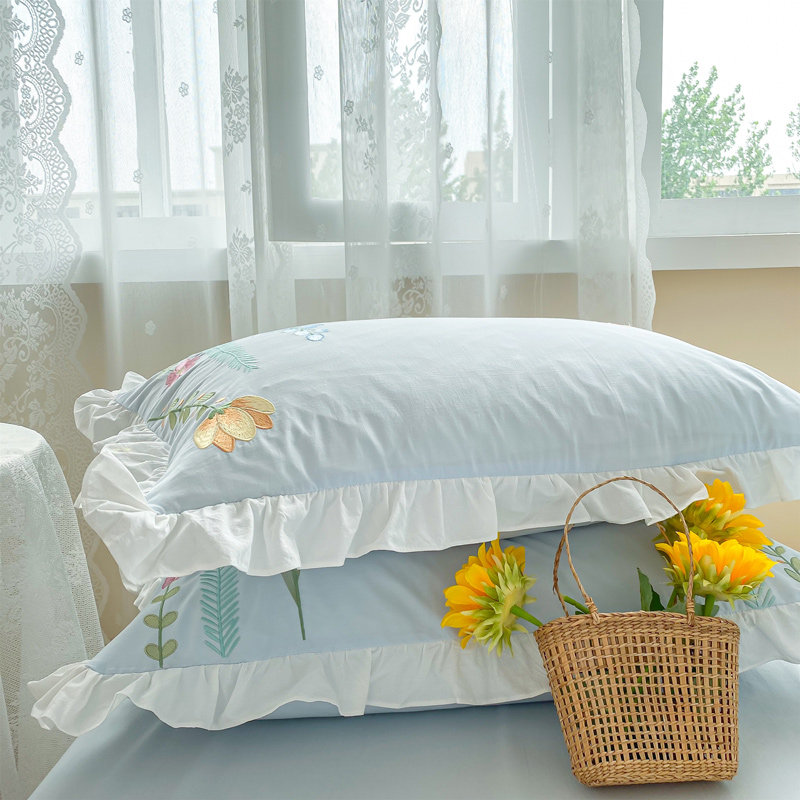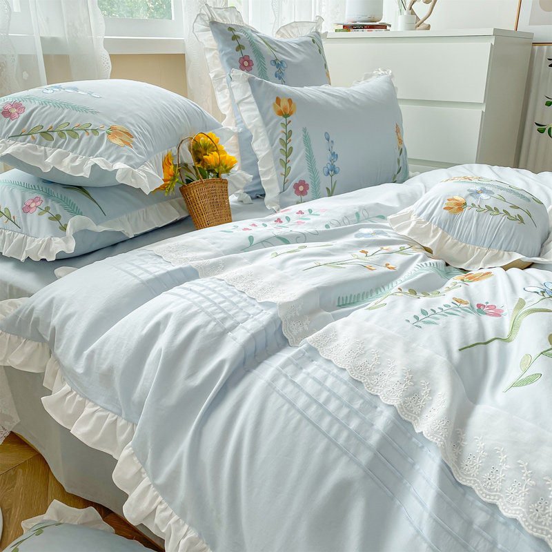 80pcs cotton washed cotton yarn-dyed four-piece embroidery blue quilt cover bed linen style pastoral style bedding 4