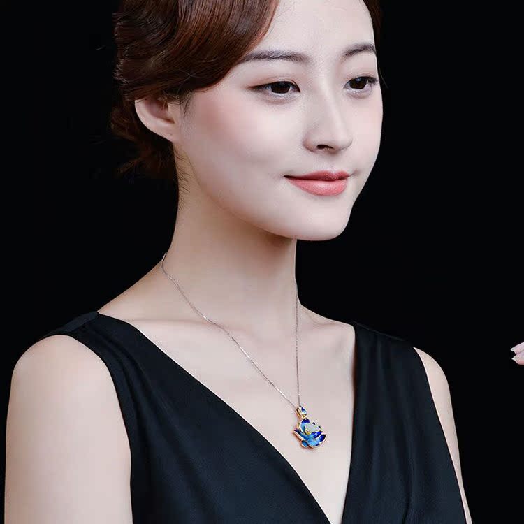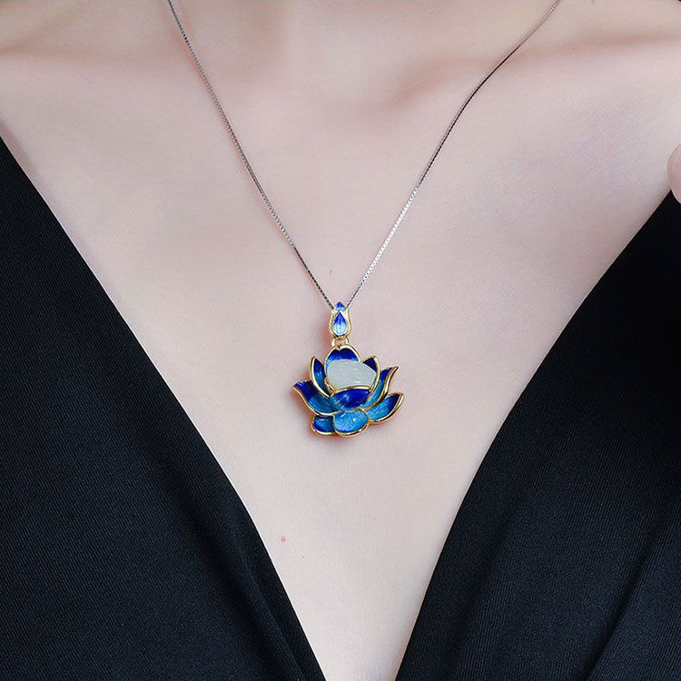 Cloisonne Lotus Pendant S925 Sterling Silver Lotus Pond Hetian Jade Necklace Retro Simple Clavicle Chain White Jade Pendant