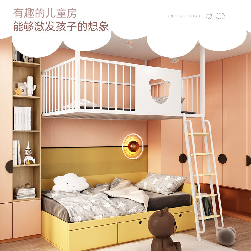 Children's Elevated Bed Small Family Type Duplex Second Floor Bed Apartment Bedroom Single Upper Floor Province Space Floor Attic Iron Art Hammock