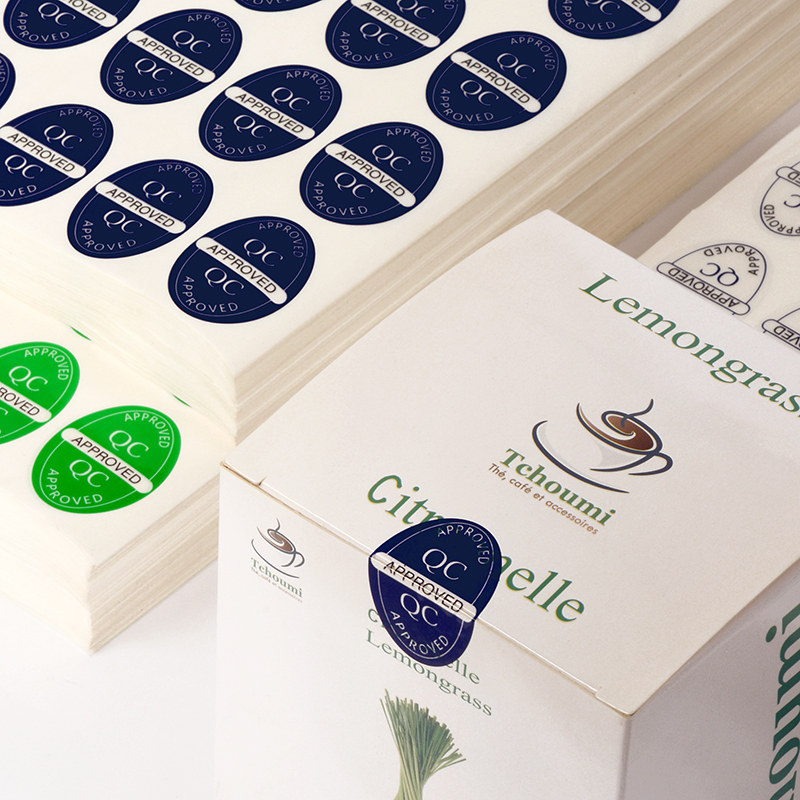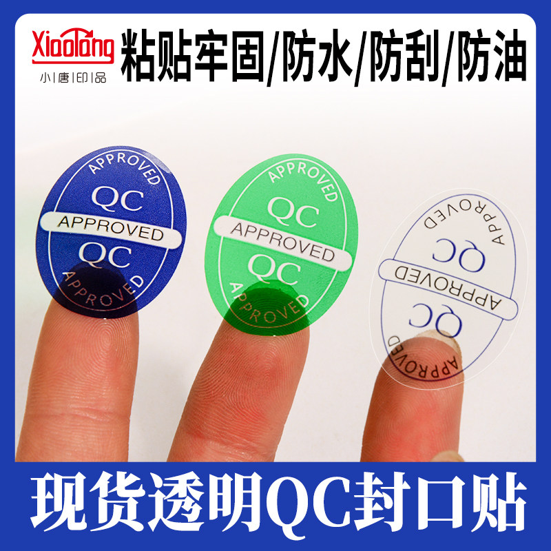 Spot small Tang print Pink green QC adhesive label transparent printing customized closure sticker PVC UV-ordered labeling