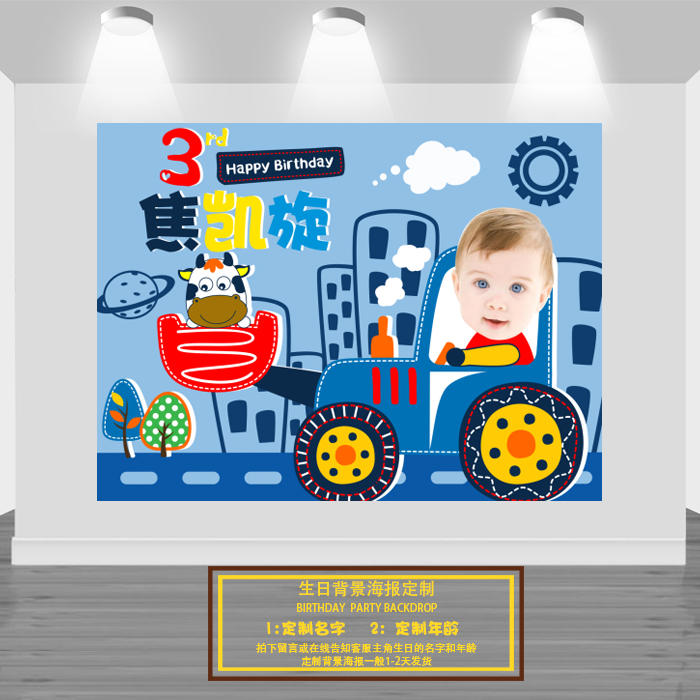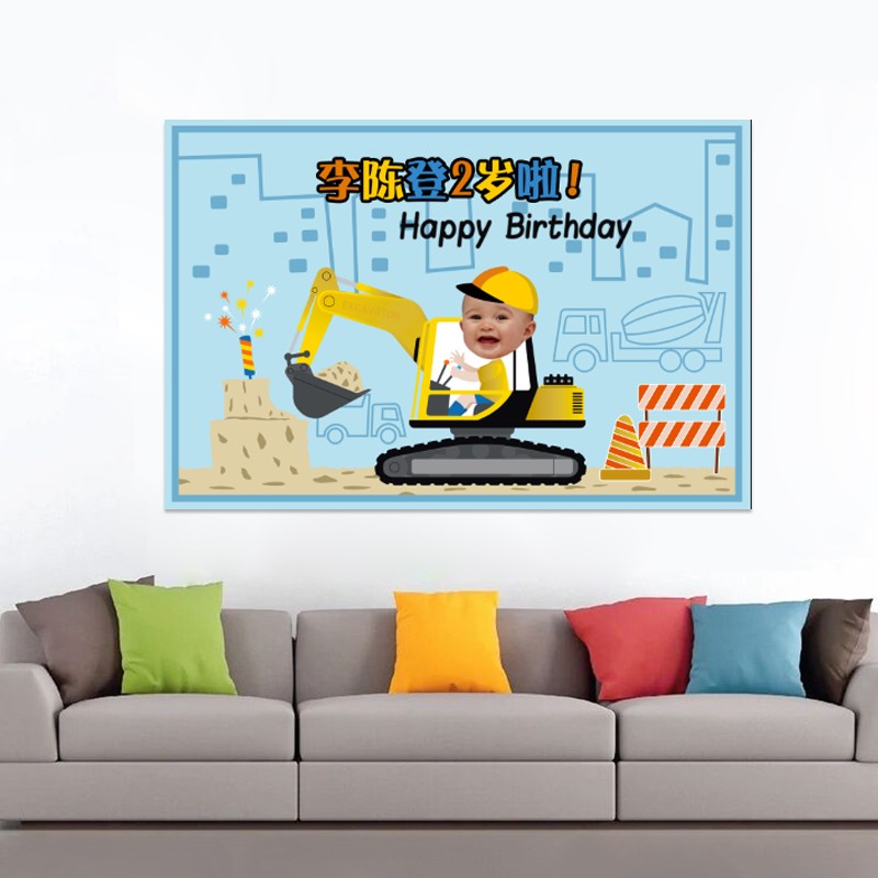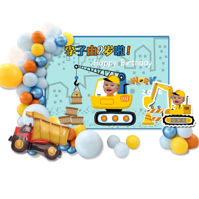Blue excavator crane boy birthday theme poster decorated background balloon package