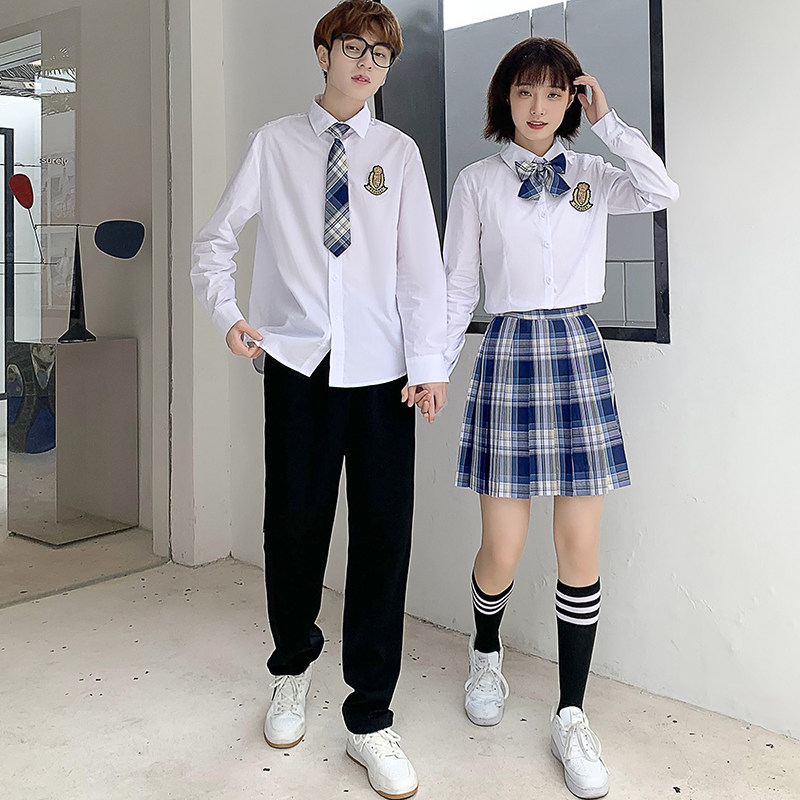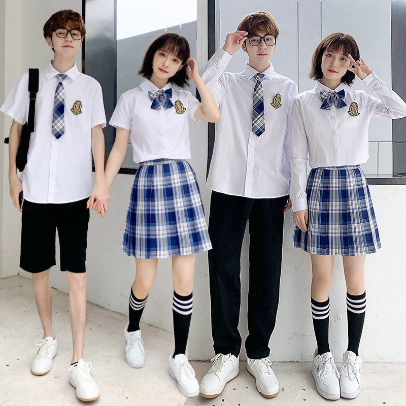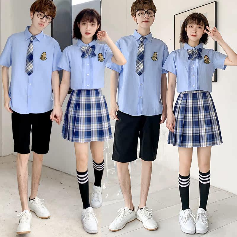 Women's white short-sleeved shirt Blue and white short skirt men's white short-sleeved shirt Black shorts women's blue short-sleeved shirt Blue and white short skirt men's blue short-sleeved shirt Black shorts women's white long-sleeved shirt Blue and white short skirt men's white long-sleeved shirt