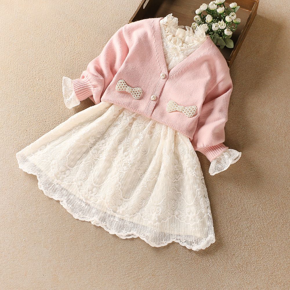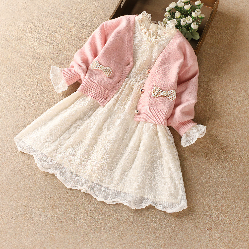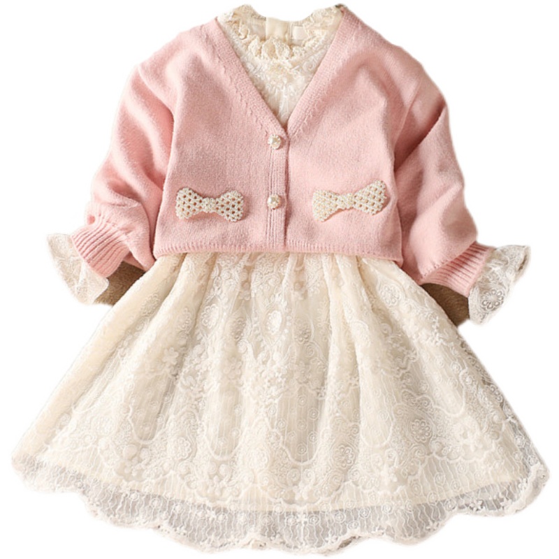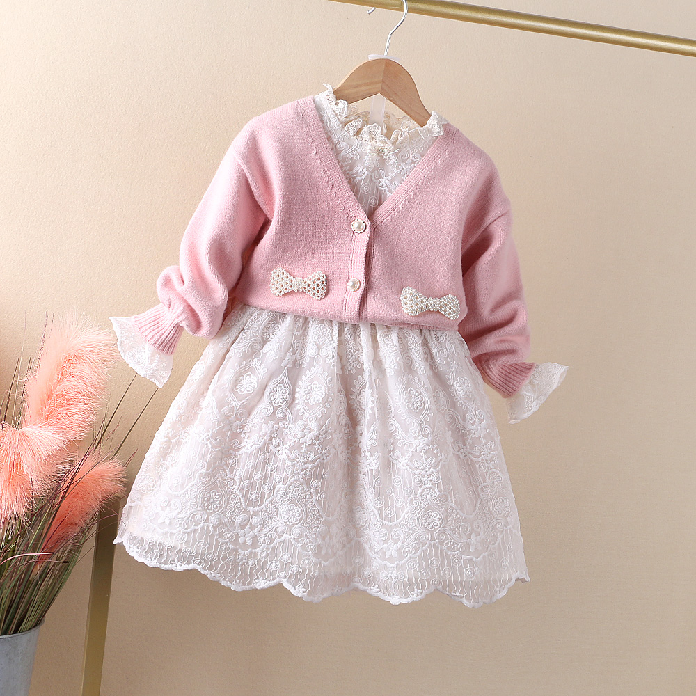 Girl Princess Dress 2022 Spring Dress New Pink Knit Cardio-hoodie Suit Skirt Children Sweet Merise Silk Dress
