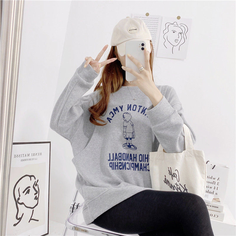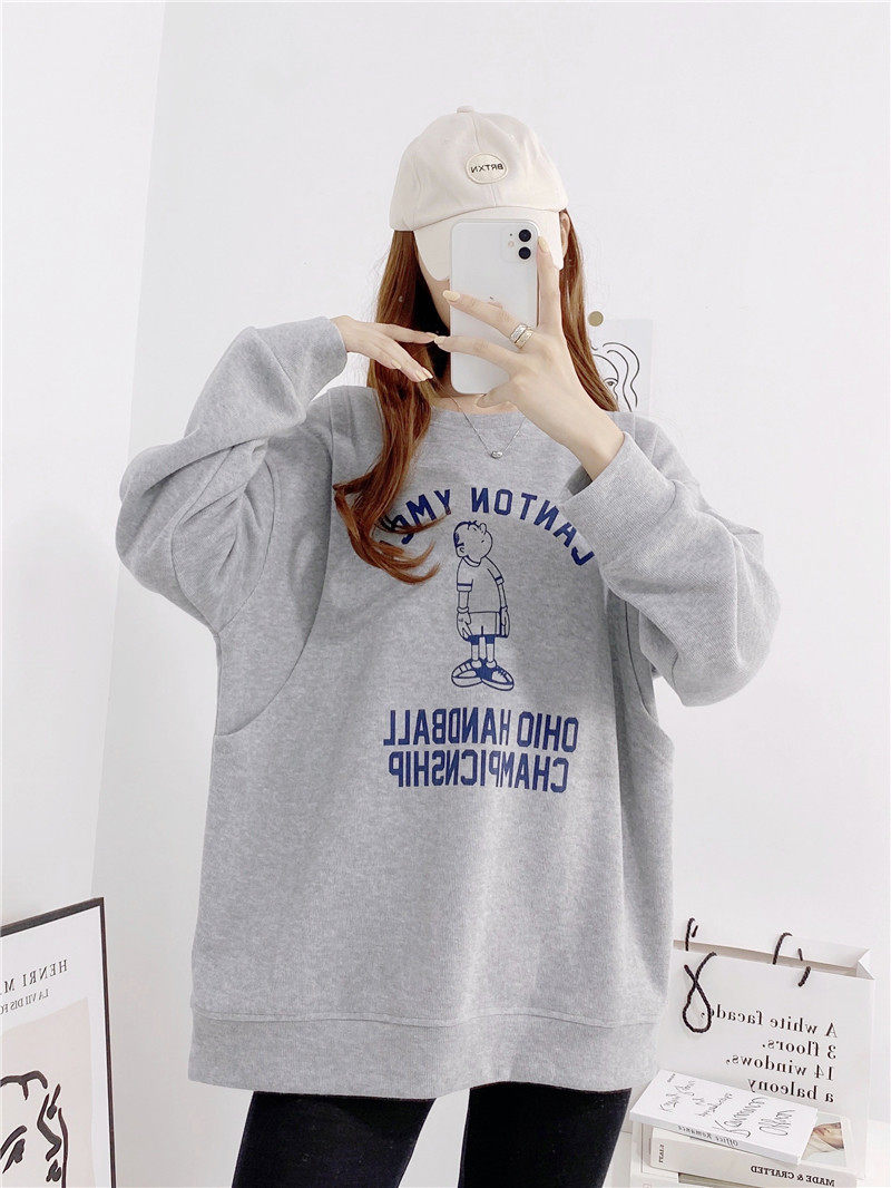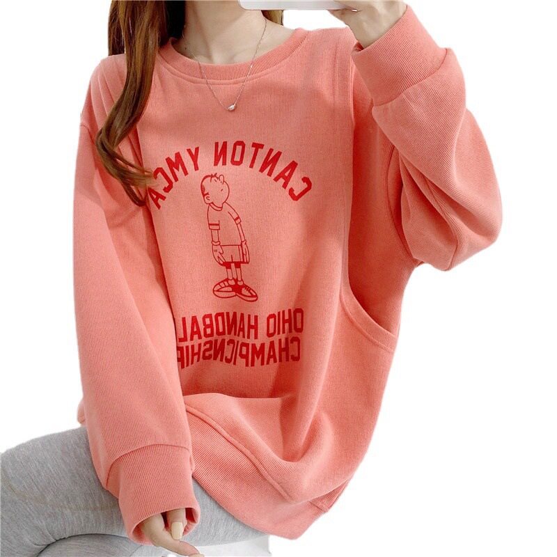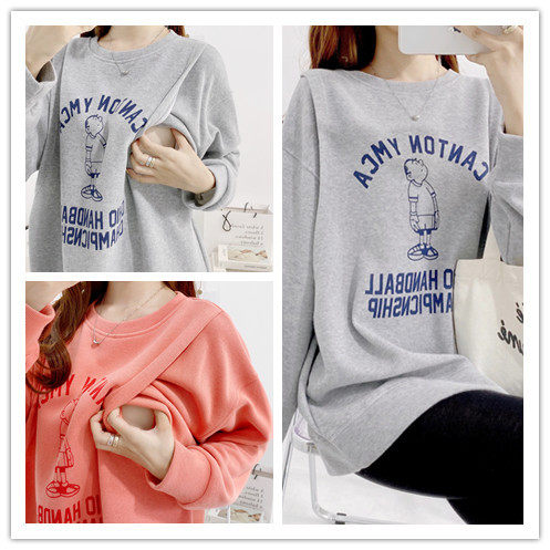 Autumn new go out round neck thick cotton T left and right side opening breastfeeding large size loose top mid-length fashion trend