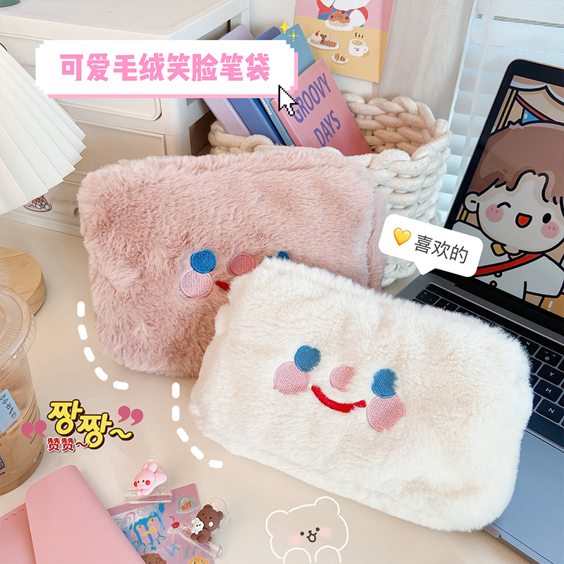 Smiley plush pencil bag ins Japanese cute girl heart large capacity furry girl cosmetic bag stationery box