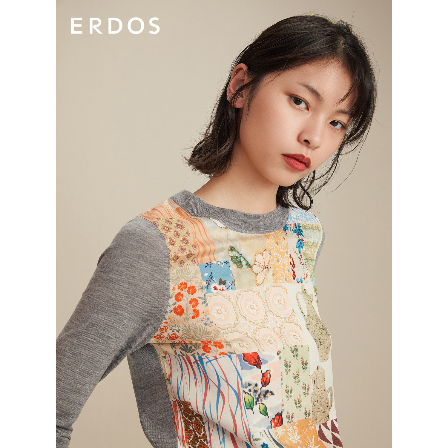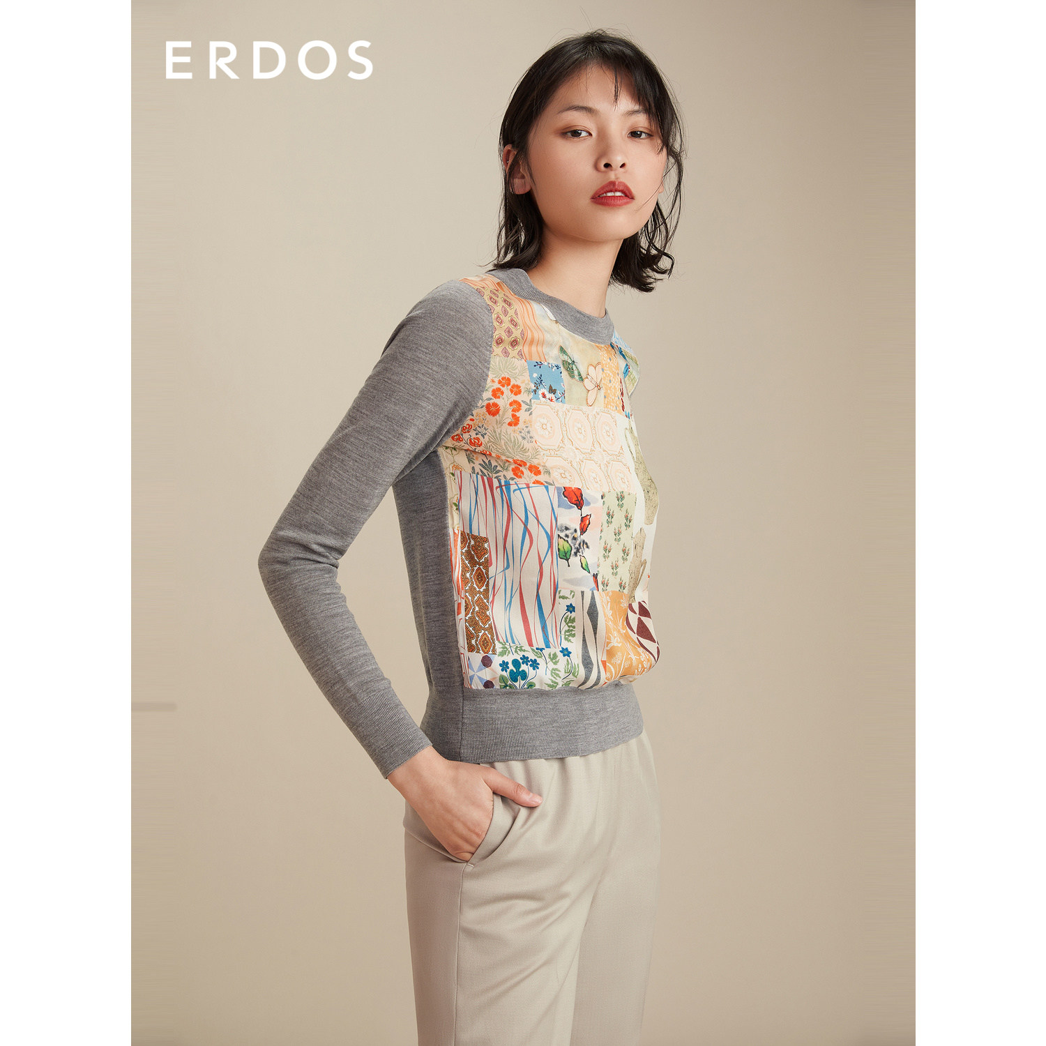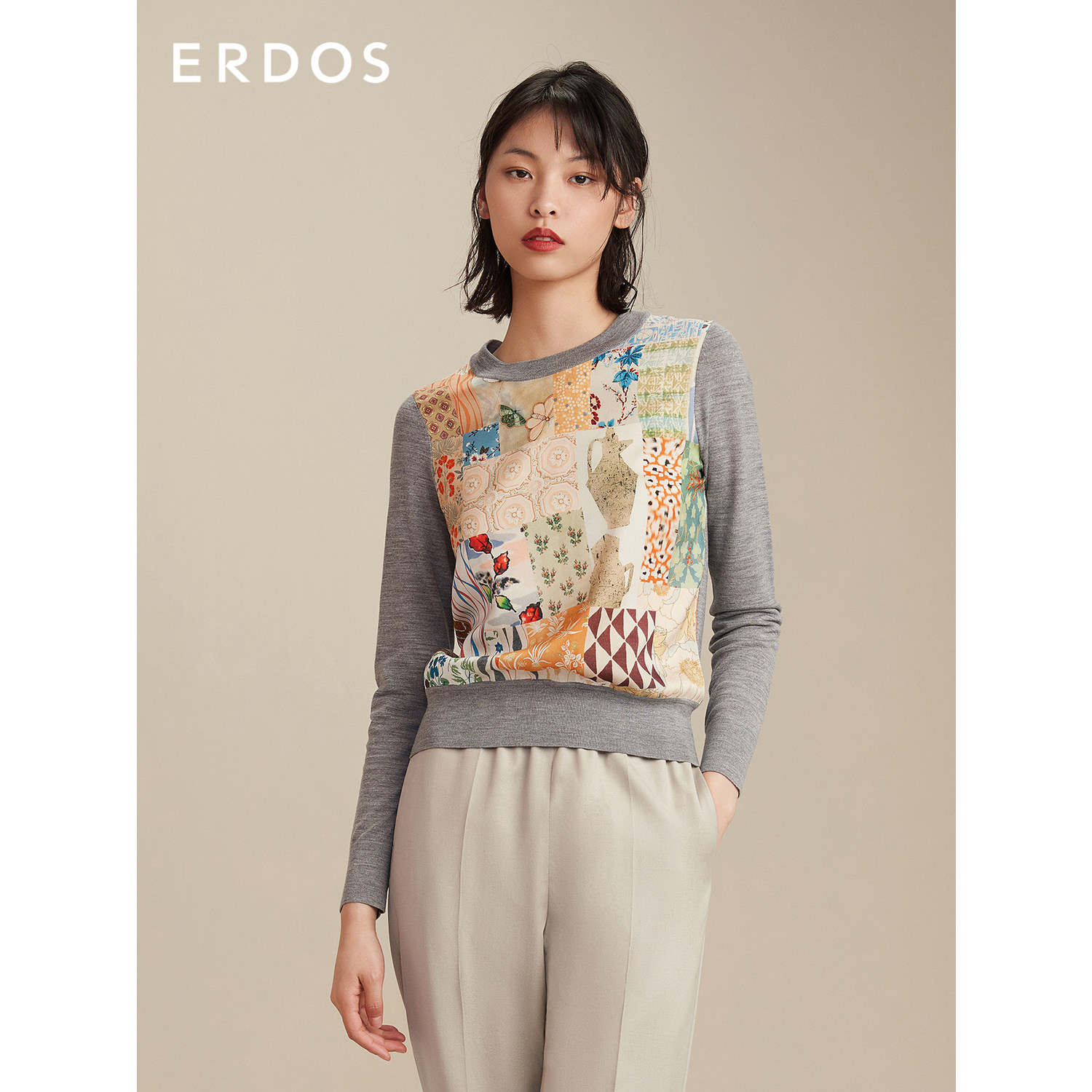 ERDOS Spring Summer Round Collar Stitch Shuttle Splicing Wool material Long sleeves Knitted Sweatshirt Woman Blouse Commute