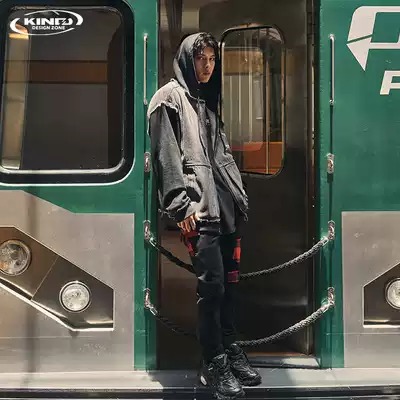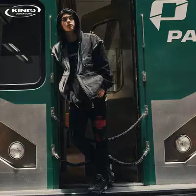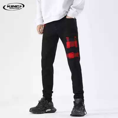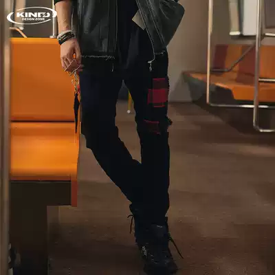KDZ slim stitching jeans men's feet tapered 2021 autumn and winter new red and black grid fabric stretch trousers tide