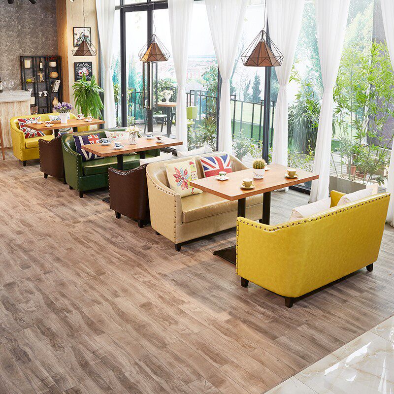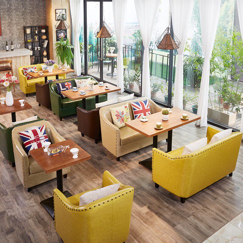 Brown double sofa green double sofa 60*75H round table 60*60*75H square table 120*60*75H long table yellow double sofa brown single sofa green single