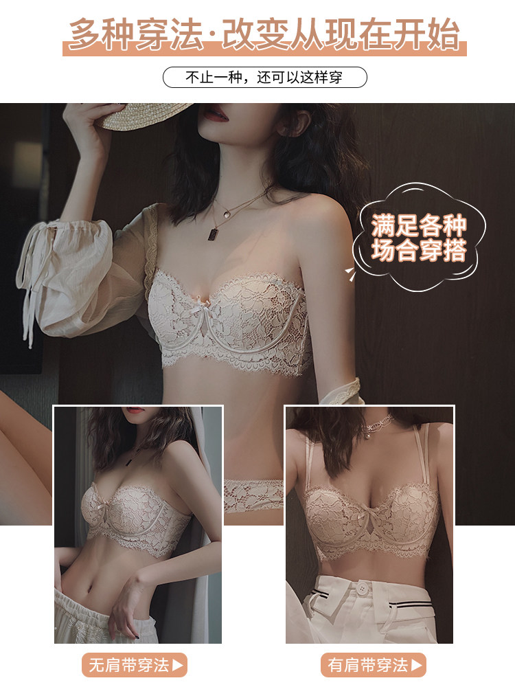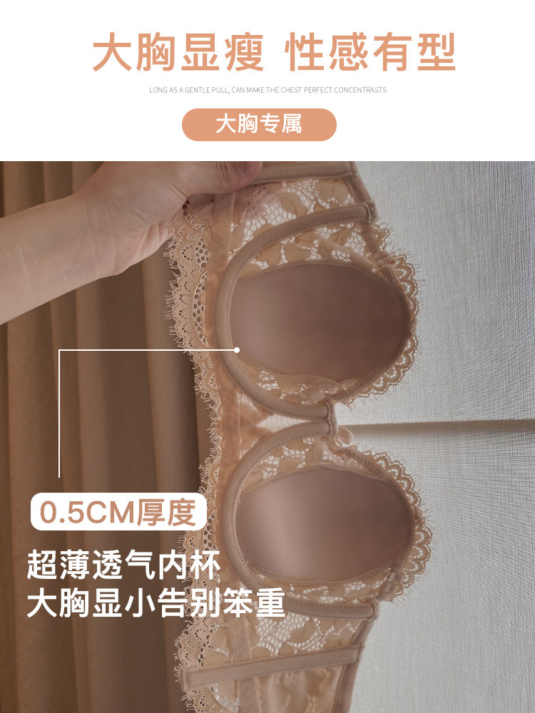Sexy Lace Beauty Back Without Shoulder Strap Underwear Woman Thin soft steel ring large chest showing small anti-sagging text bra suit Summer