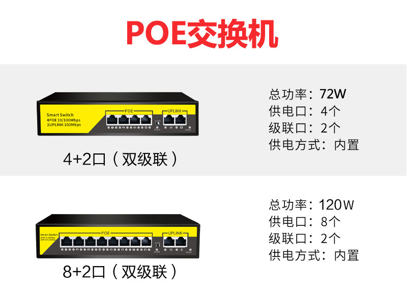 Standard 100 megabit 4 power port 2 network port 1236 72W standard 100 megabit 8 power port 2 network 1236 120W1 inlet 2 out repeater POE