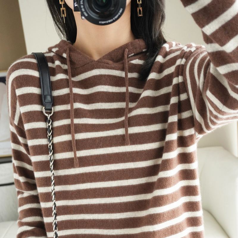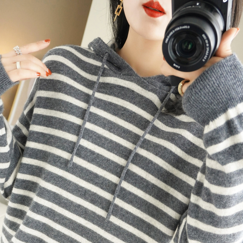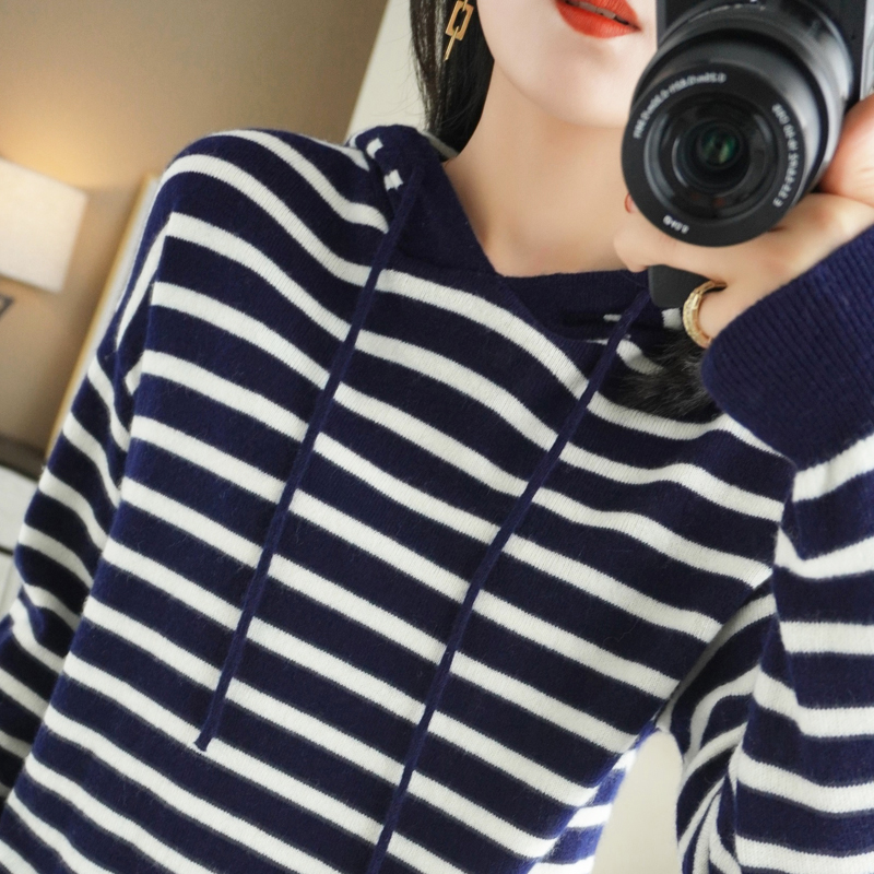 Even cap sweater female set head to thin retro external wearing Korean version striped collared long sleeve non-cashmere knitted sweatshirt undercoat