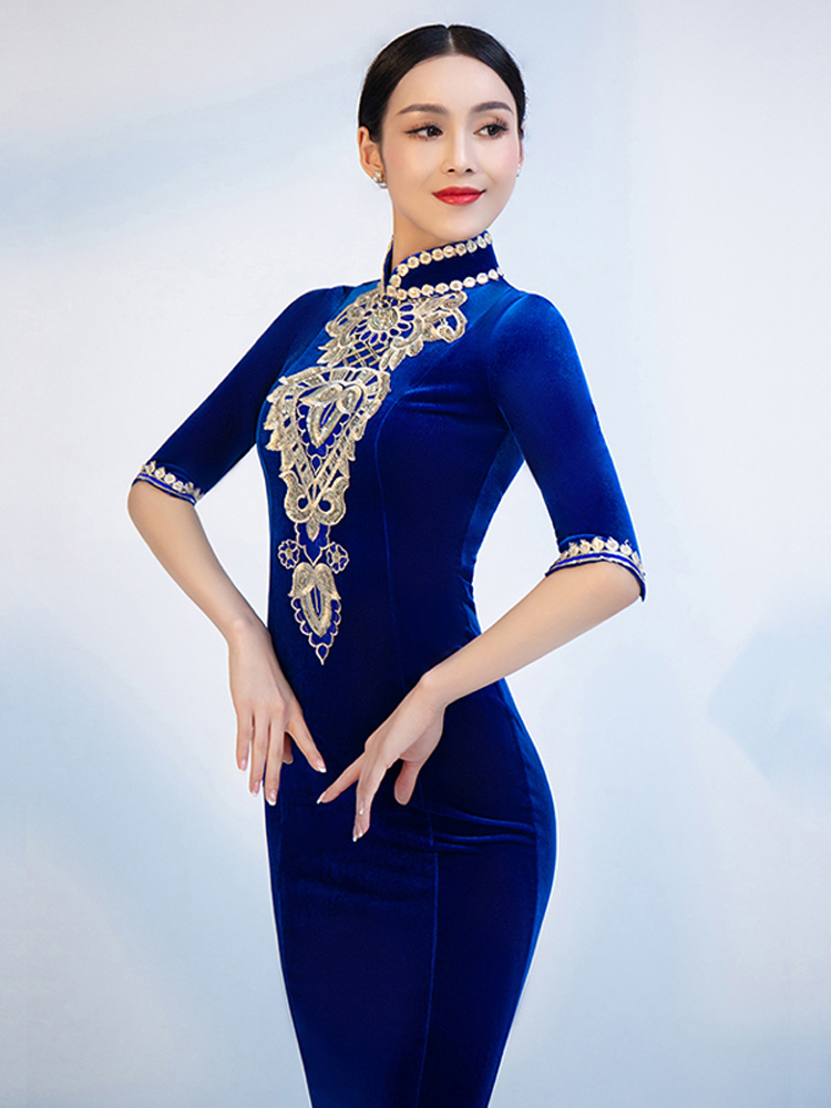 Treasure Blue Retro Classic Embroidered Body Gift Instrument Long Version Qipao Tutor Mentor Woman New Dance Walk Show Bag Hip Sexy