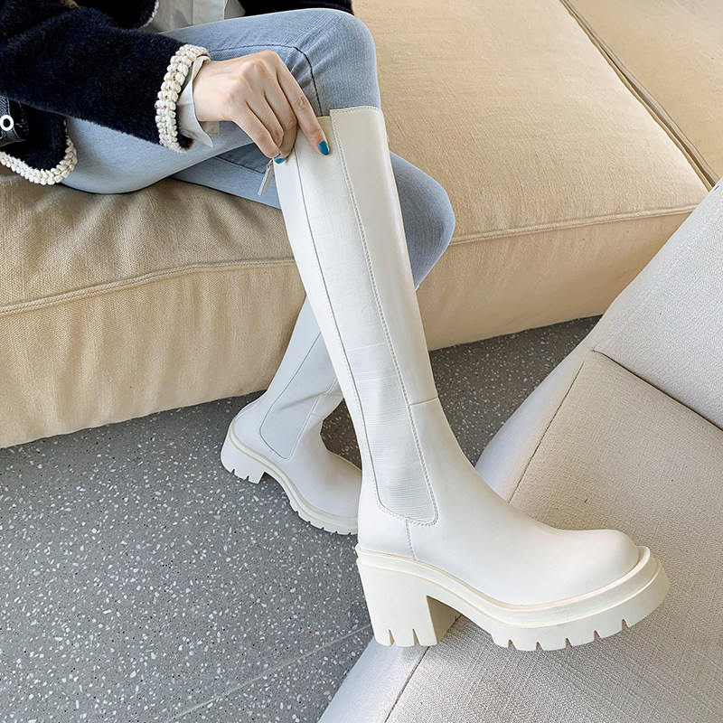 New spring and autumn white boots high-heeled leather knight boots women's tall thick-heeled chimney boots thick-soled slim boots