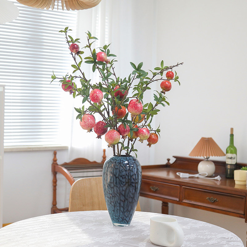 1 branch of hairy fruit, 1 branch of pomegranate, 3 branches of pomegranate, 3 branches of pomegranate, 5 branches of hairy fruit, cyan glass vase
