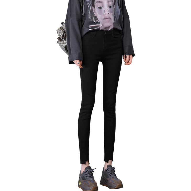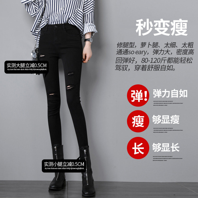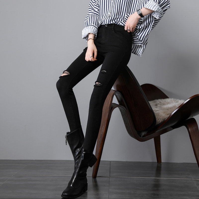 Black Broken Cave Jeans Woman Tight Fit Autumn Winter New High Waist Hew Open Fork Smoke Tubes Pants Children slim 100 hitch