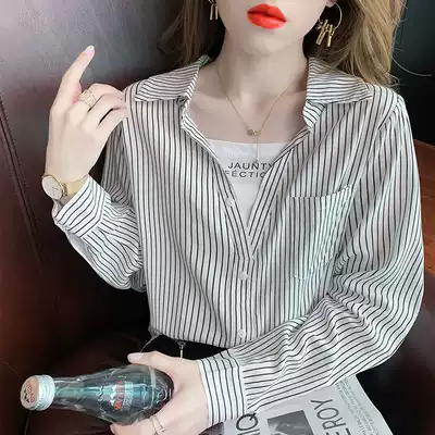 Autumn Korean fashion Joker Slim Patchwork Striped Shirt Women's Long Sleeve Fake Two-Piece Blouse French niche shirt