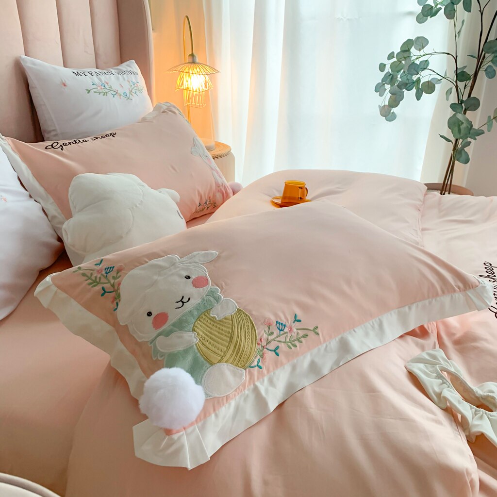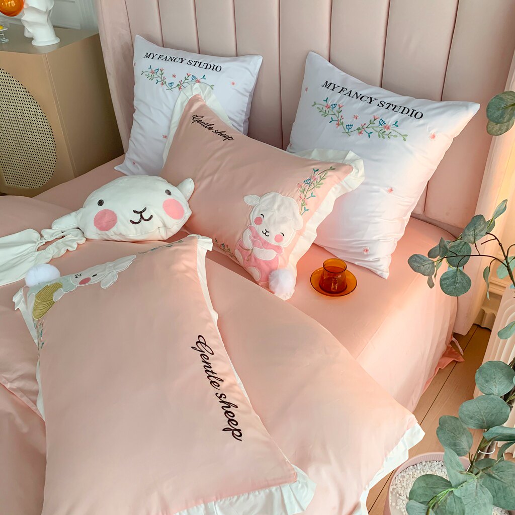 80s long-staple cotton four-piece set of cotton pure cotton satin cartoon powder embroidery children's cute girl heart bedding 4