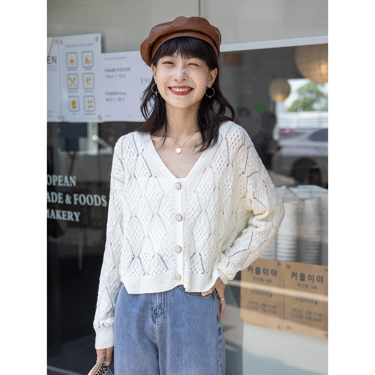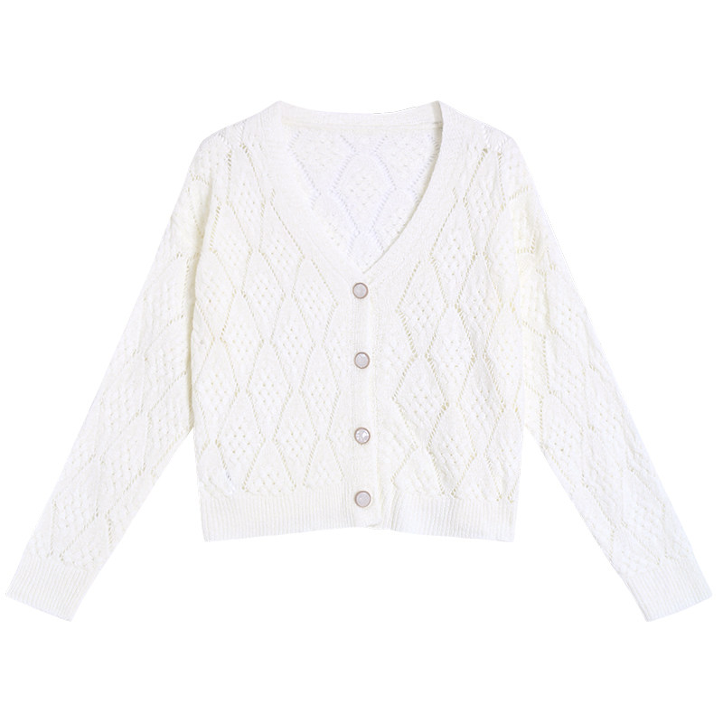 Autumn thin crochet knitted cardigan white gentle women's new loose and thin coat with suspenders