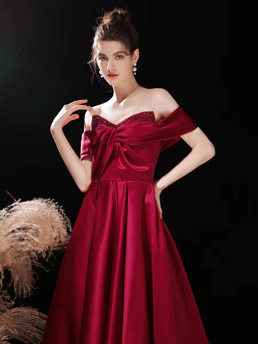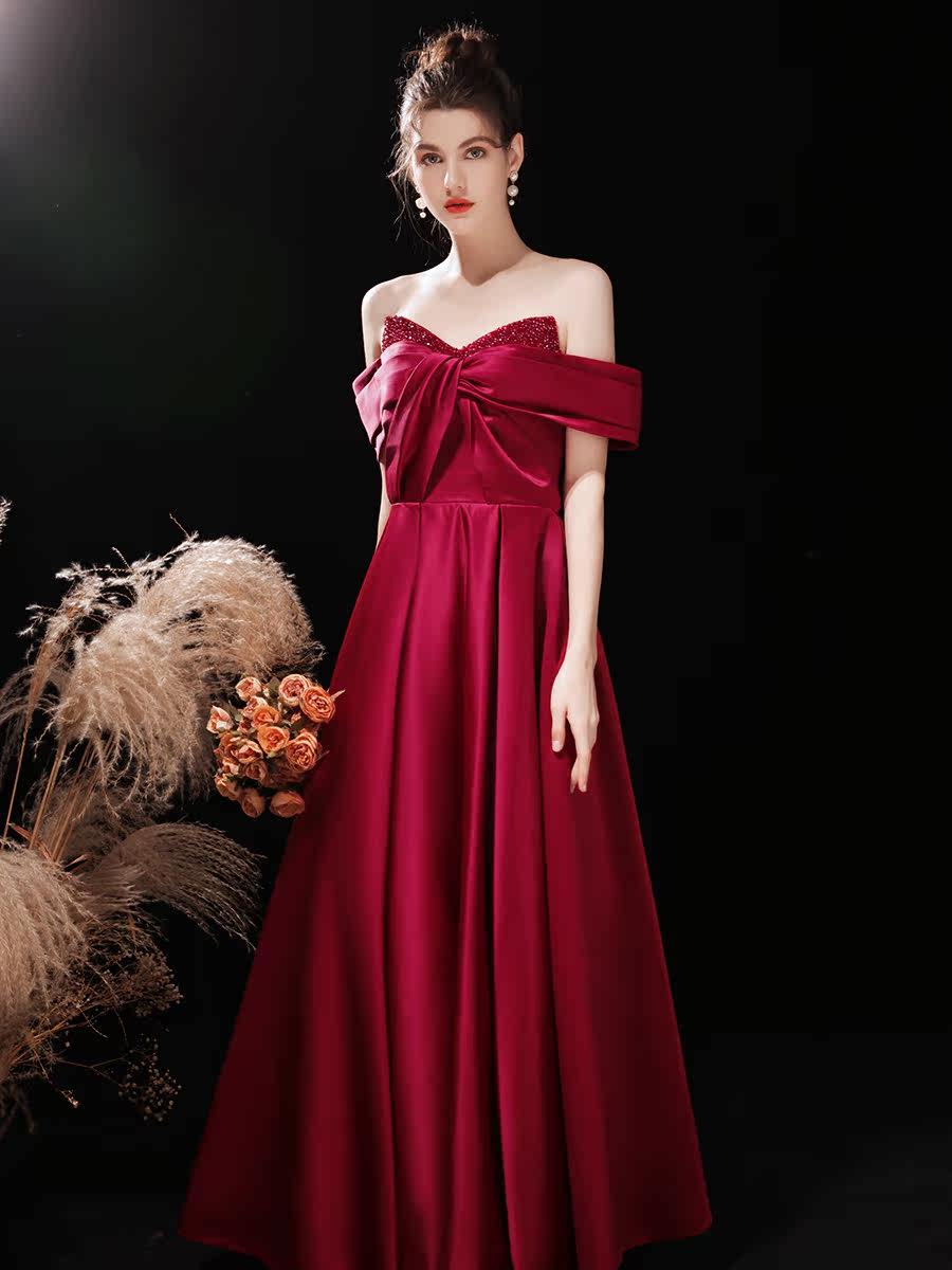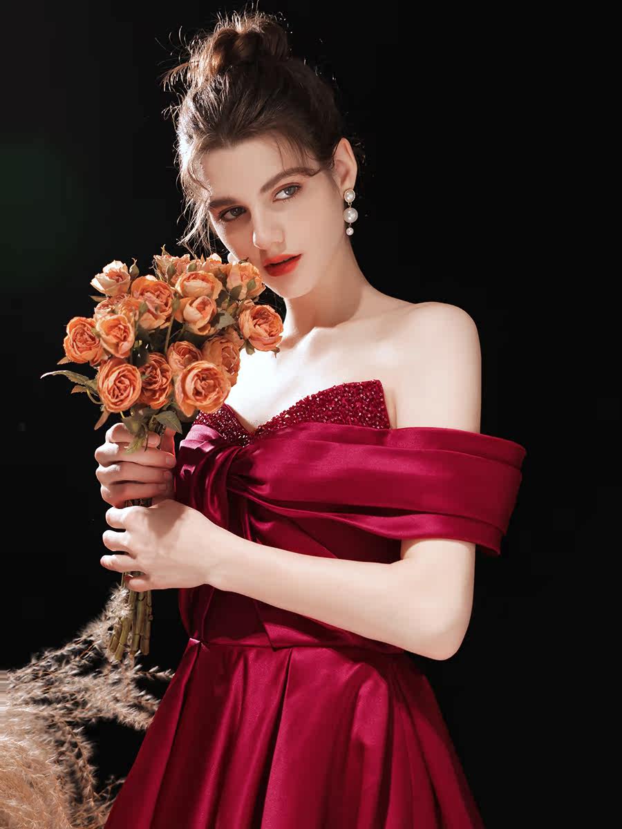 Wine red satin toast dress bride 2021 new wedding high-end light wedding dress one-shoulder engagement dress female