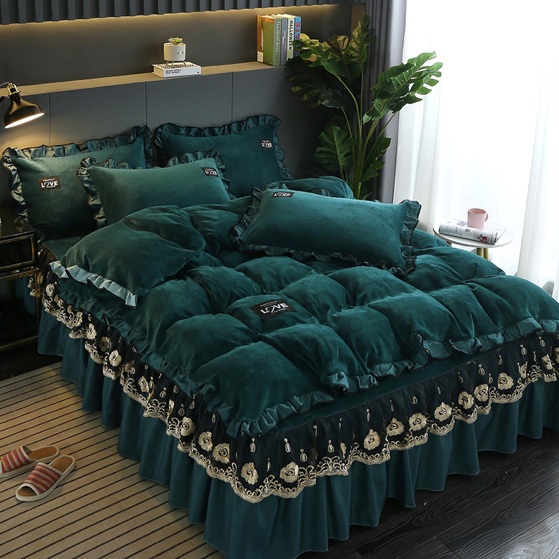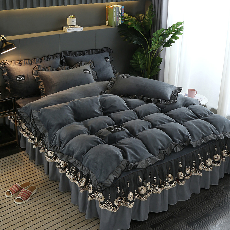 Korean Version Coral Suede Bed Skirt Four Pieces Of Wedding Celebration Large Red Thickened Flannel Velvet Pure Color Lace Quilt Cover Bed Linen